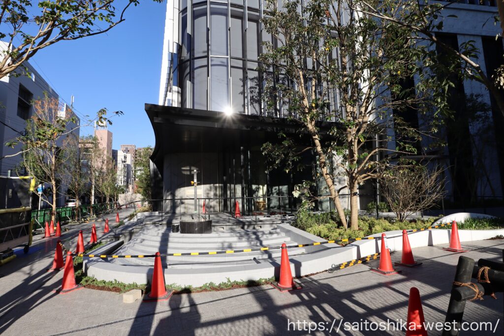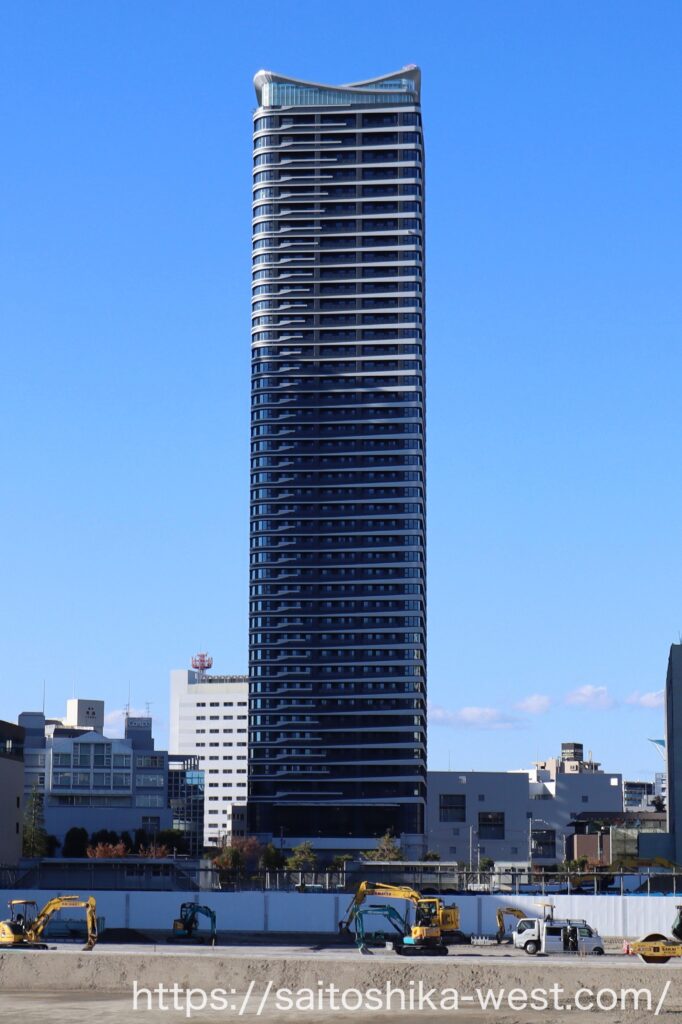 南東側から見た様子です。外観は完成状態になりました!スリムな外観形状に加え、高さが168mもあるので、かなり高く感じます。