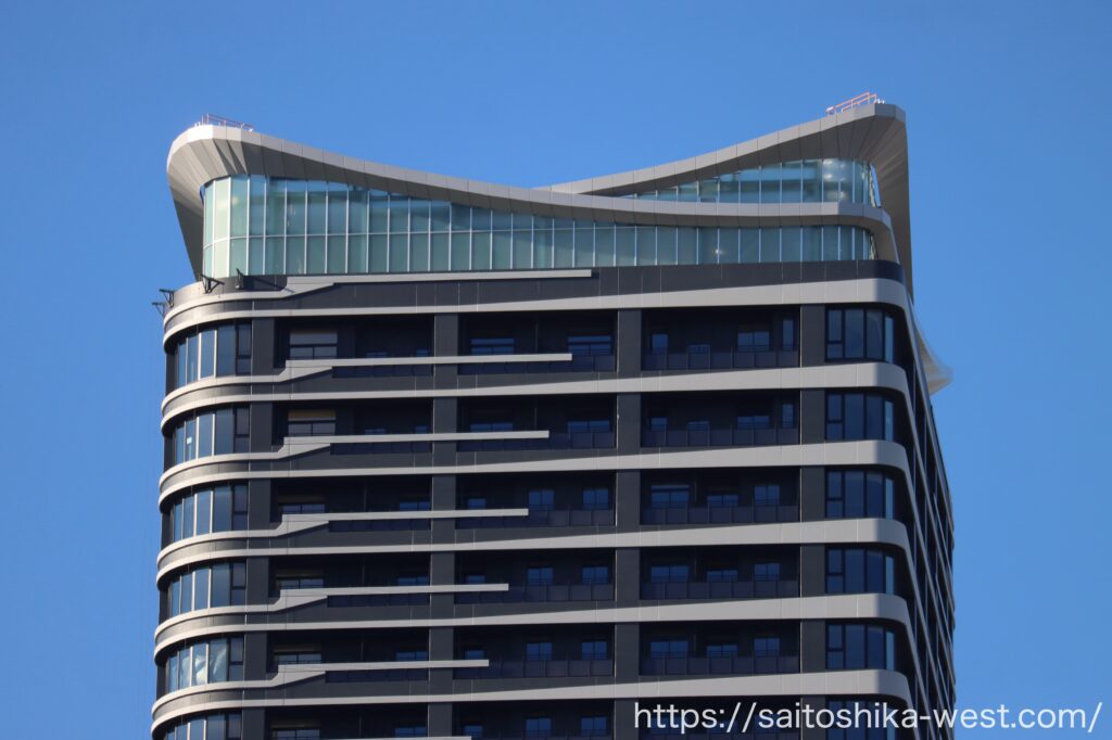 近くで見上げた様子です。有機的なデザインが高級感を醸し出しています。只者ではないオーラをまとったタワーマンションですね。