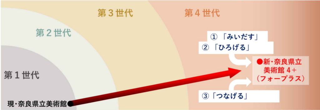 奈良県は、新しい県立美術館を「第4世代」の美術館と位置づけています。表現はやや専門的ですが、意味は明快です。作品を集めて保存し、展示するだけでなく、地域、観光、教育、福祉、国際交流などともつながりながら、新しい価値を生み出す美術館を目指すという考え方です。