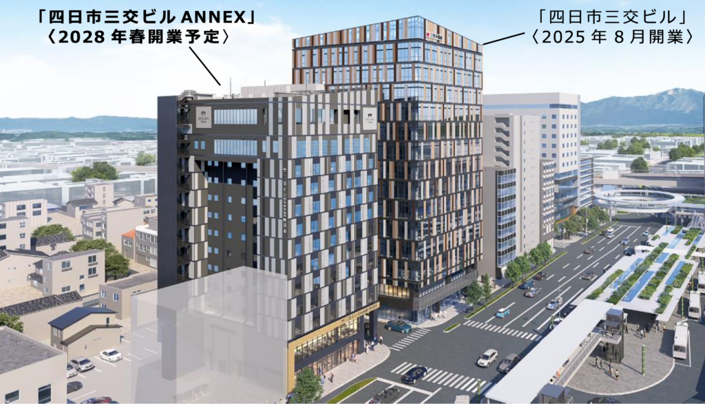 今回の計画の特徴は、昨年8月に開業した隣接の「四日市三交ビル」と一体で駅前機能を強化する点にあります。既存の四日市三交ビルがオフィス主体、ANNEXがホテル主体という役割分担となっており、業務、宿泊、商業の機能を駅前に重ねることで、近鉄四日市駅前の都市機能をさらに厚くする狙いです。