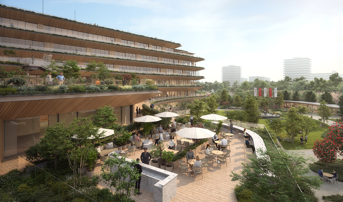 設計・監修を担当するのは隈研吾建築都市設計事務所です。計画地は神宮東公園に隣接しており、建築コンセプトは、「周辺環境との調和」「公園に開かれた風通しの良いオフィス」「心地よく働ける環境」です。