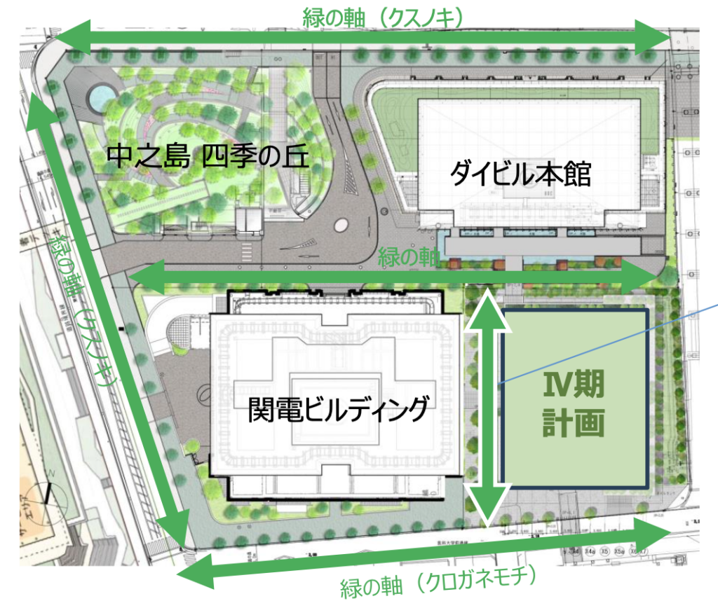 この計画は、1997年から段階的に進められてきた「中之島三丁目共同開発」の最終段階にあたります。これまでに、第Ⅰ期として関電ビルディング、第Ⅱ期として中之島ダイビル、第Ⅲ期としてダイビル本館と「中之島 四季の丘」が整備されており、今回のⅣ期計画はその総仕上げとして位置づけられています。