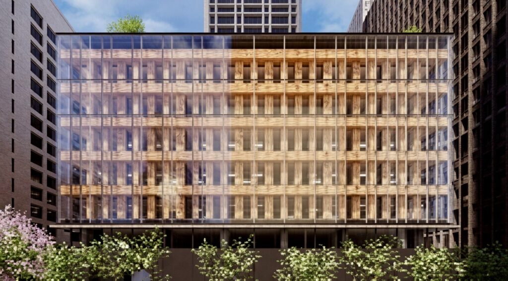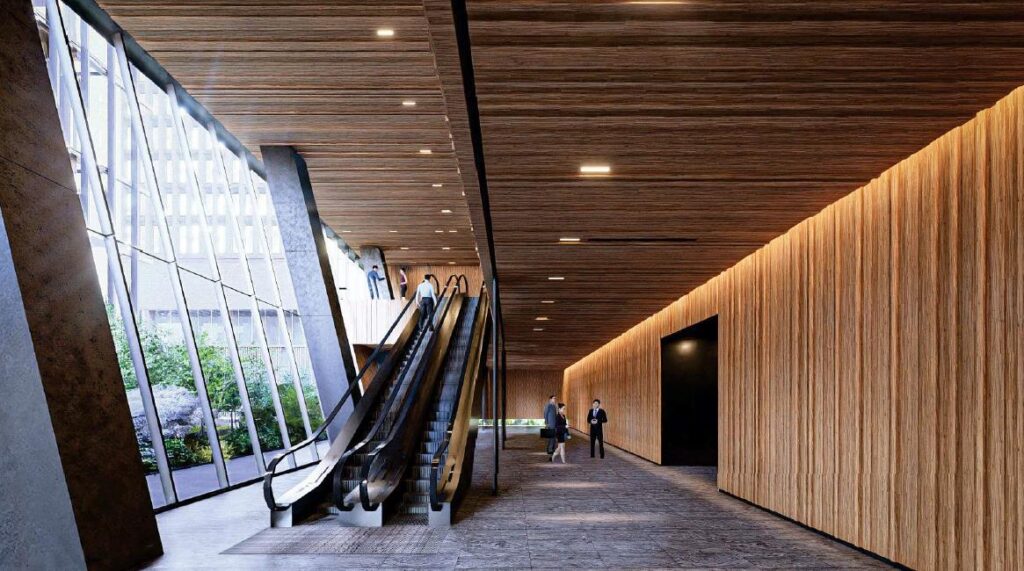 このビルでは、内外装に木質素材を採用するほか、構造面でもCLT耐震壁を活用します。都市部のオフィスビルとしては、木質素材の活用を比較的強く打ち出した計画であり、意匠面だけでなく、働く環境の質の向上も意識した設計となっています。