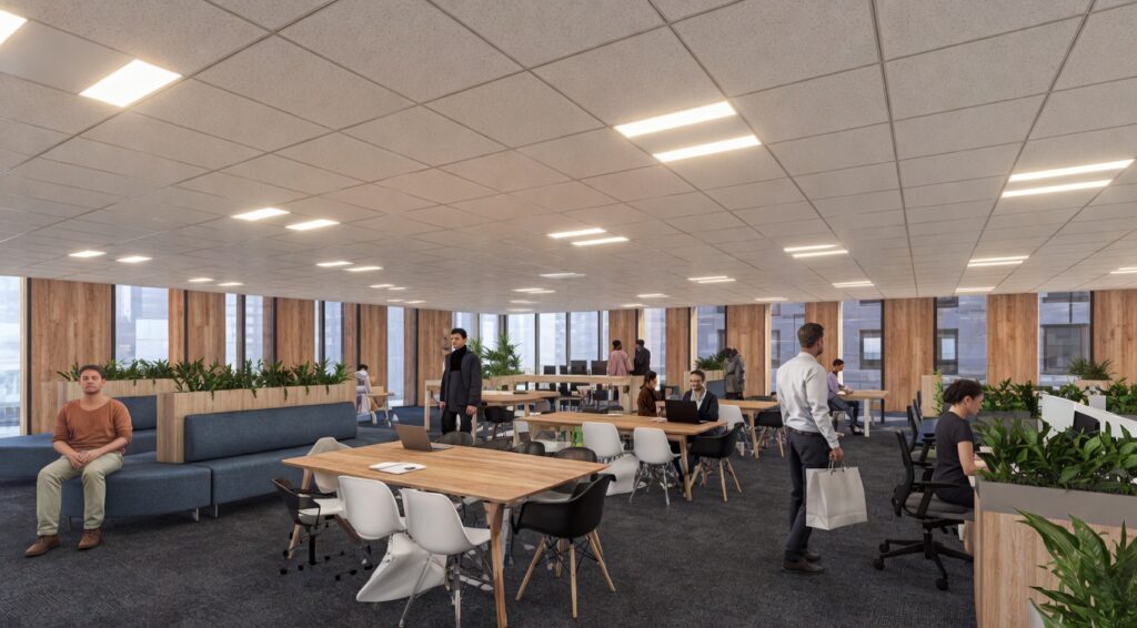 あわせて、高断熱性能や各種環境配慮技術の導入により、年間の一次エネルギー消費量を50%以上削減する計画です。設計段階では、「ZEB Ready」認証と「CASBEE大阪みらい」の最高評価であるSランクも取得しています。木質デザインを特徴としつつ、環境性能でも高い水準をめざしている点が、このビルの特徴といえます。