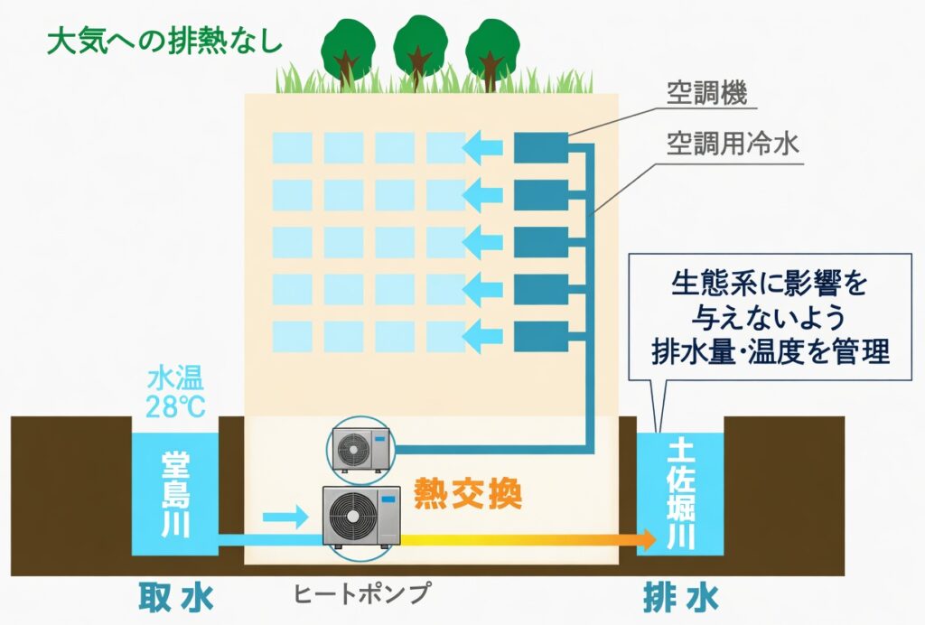 環境性能の高さも、この計画の大きな特徴です。空調システムには、堂島川と土佐堀川の河川水を有効活用する高効率地域冷暖房システムを採用します。大気中への排熱を抑えながら、効率的な冷暖房を行う仕組みです。