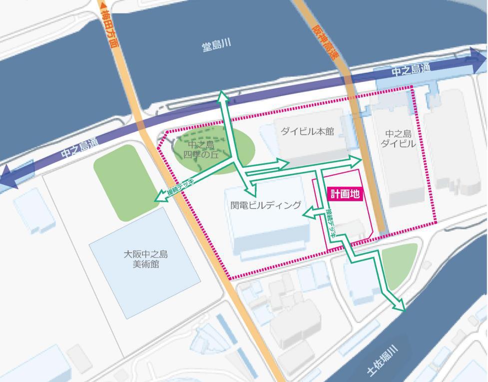 今回の計画では、建物本体に加えて、歩行者動線の整備も進められます。新たな歩行者デッキを設けることで、土佐堀川から堂島川へ抜ける南北動線を形成するとともに、大阪中之島美術館やNakanoshima Qross方面へつながる東西動線も整備します。これにより、中之島三丁目街区の回遊性向上と歩車分離による安全性向上が図られます。