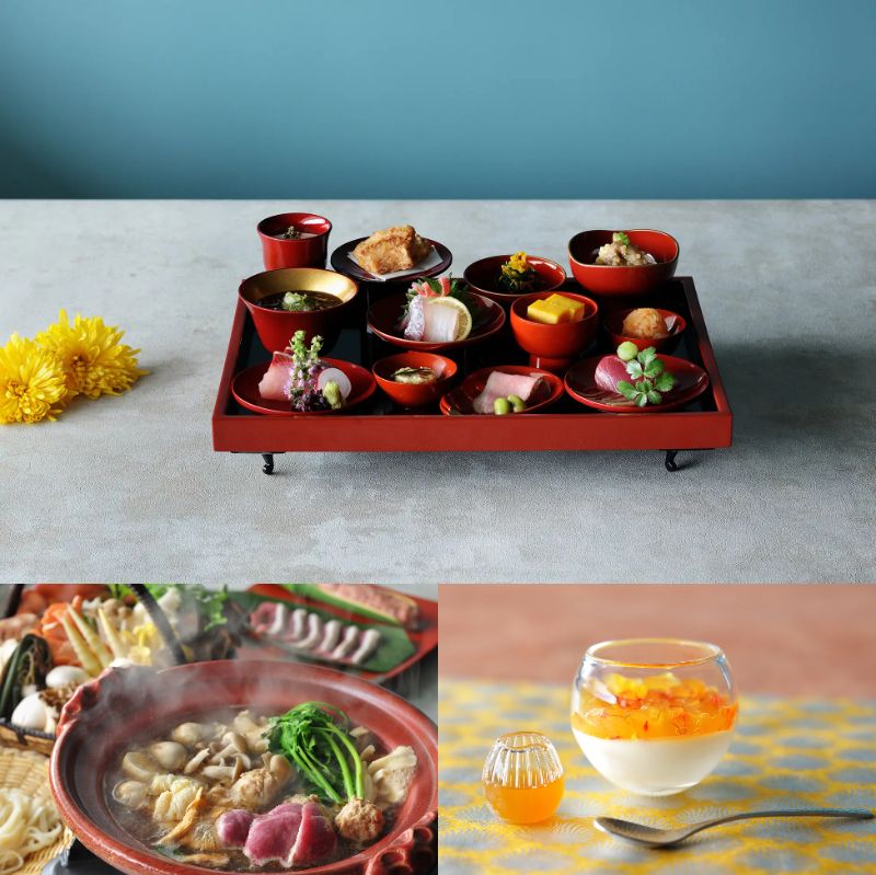 食事は、紅花文化や山形の山の食材に着想を得た「べにばな山彩会席」を提供します。朱塗りの器が印象的な「宝楽盛り」、セリや山菜、山伏茸、花弁茸など5種のきのこと鴨を味わう「月山鍋」、そして紅花と洋ナシのパンナコッタまで、土地の食文化を界らしく再編集した献立です。