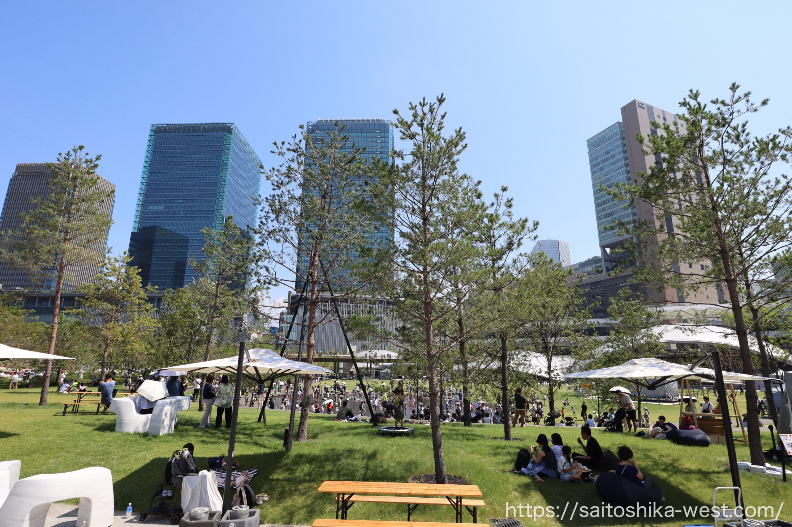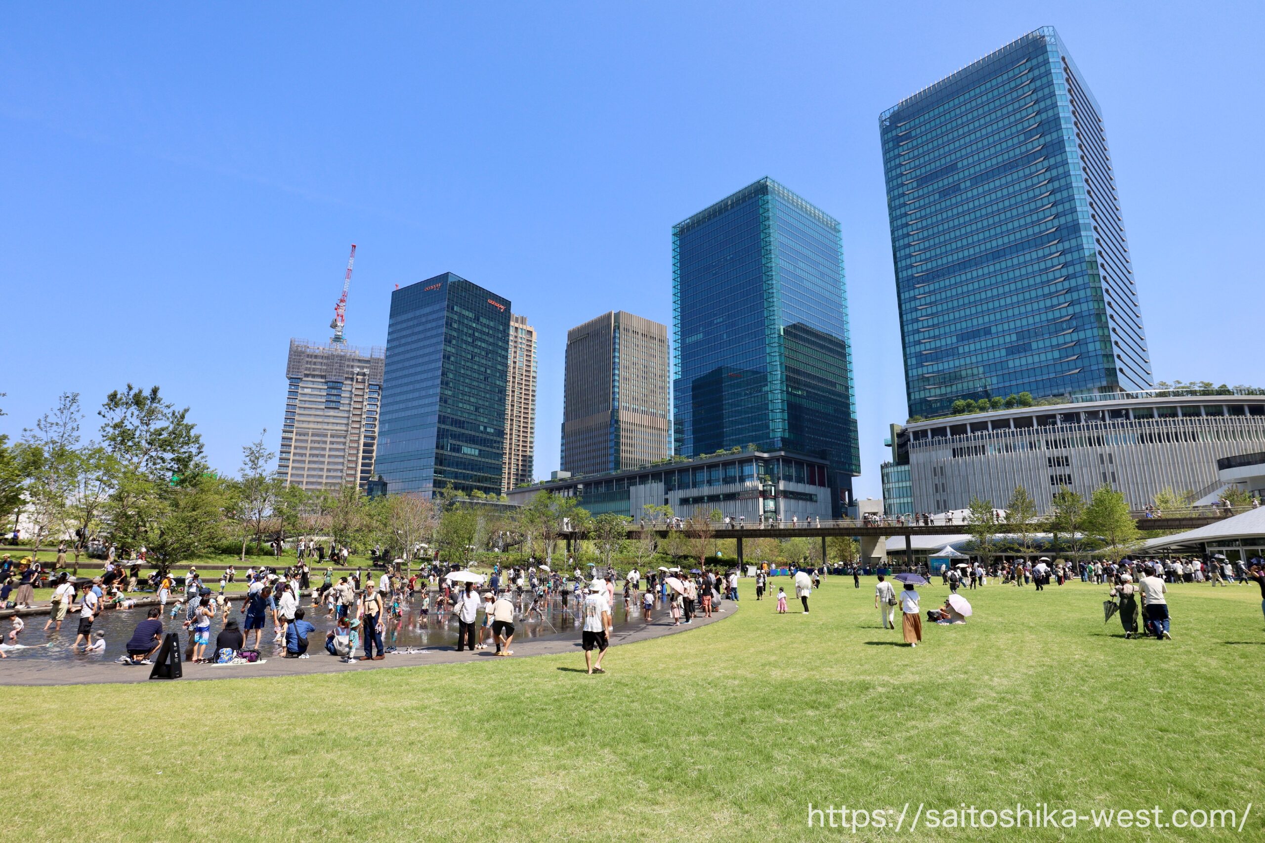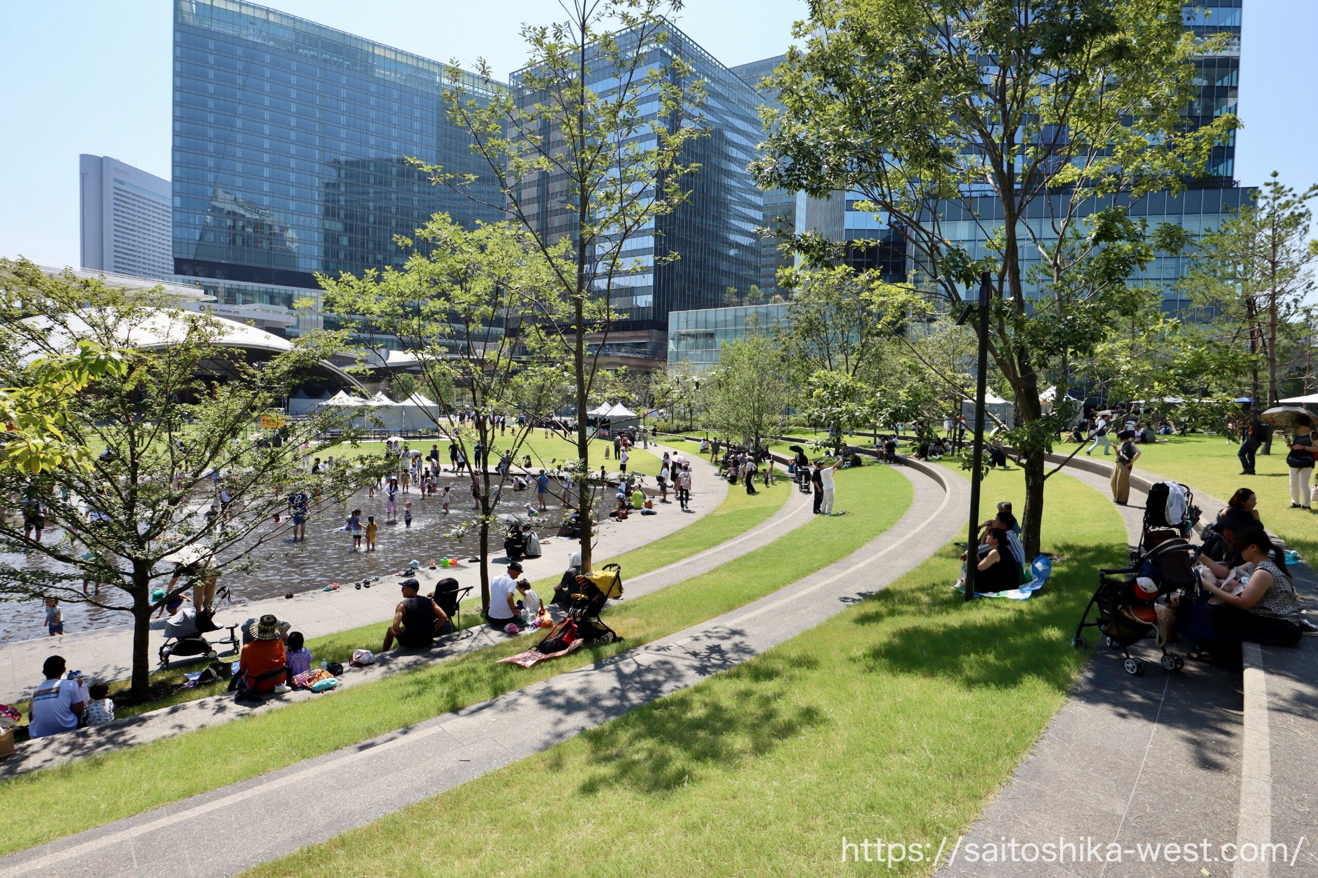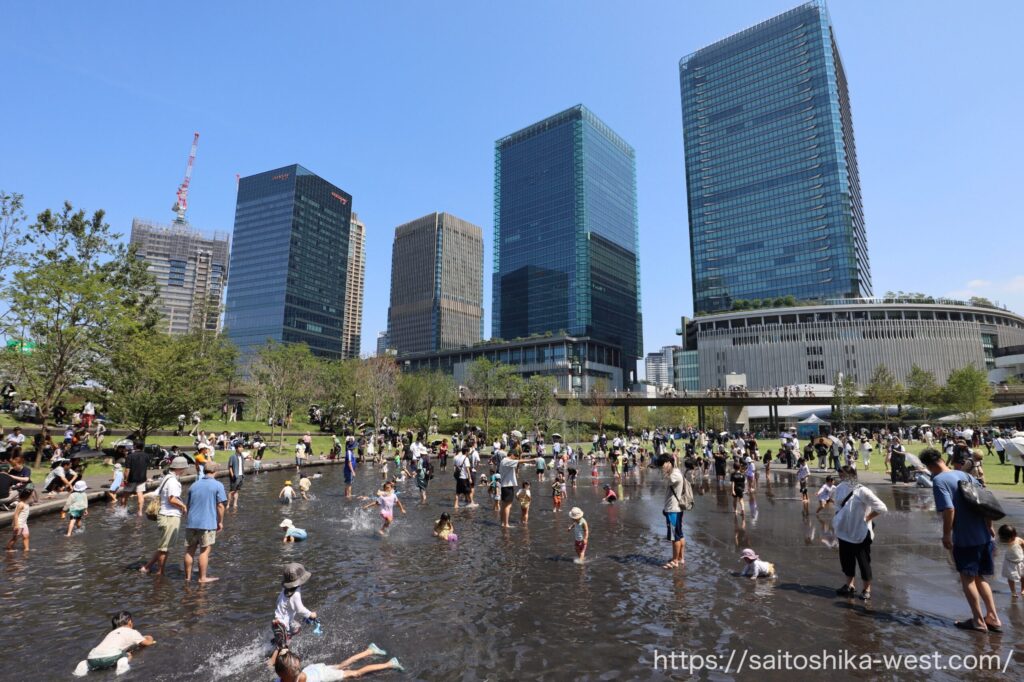 先に開業し、すでに高い支持を集めているサウスパークは、その価値を現地で実感させます。芝生の上では、人々が思い思いにくつろぎ、水景施設では子どもたちが遊び、そのそばで親たちが見守る。近隣のフードコートやコンビニで買った軽食を持ち寄れば、都心のど真ん中で気軽にピクニックのような時間も過ごせます。しかも、その背景にはガラス張りの超高層ビル群がそびえ、芝生広場の開放感と超近代的な都市景観が同じ視界の中で共存しています。そこには、かつて多くの人が未来都市に抱いたイメージが、現実の風景として立ち現れているような凄さがあります。