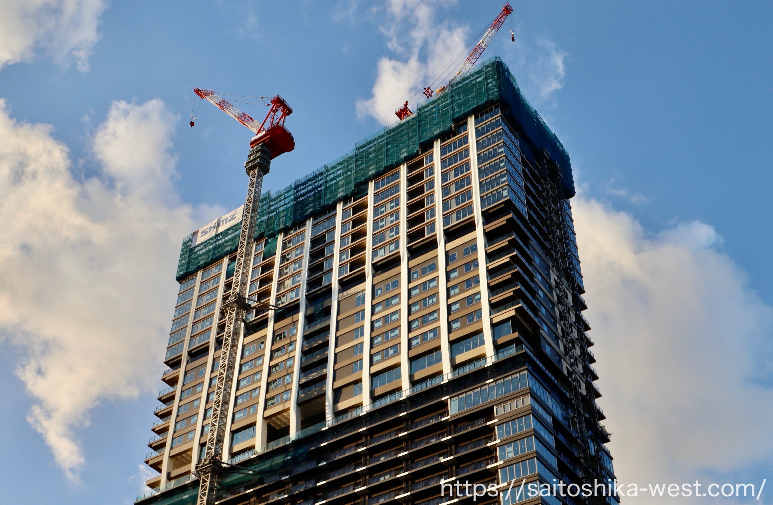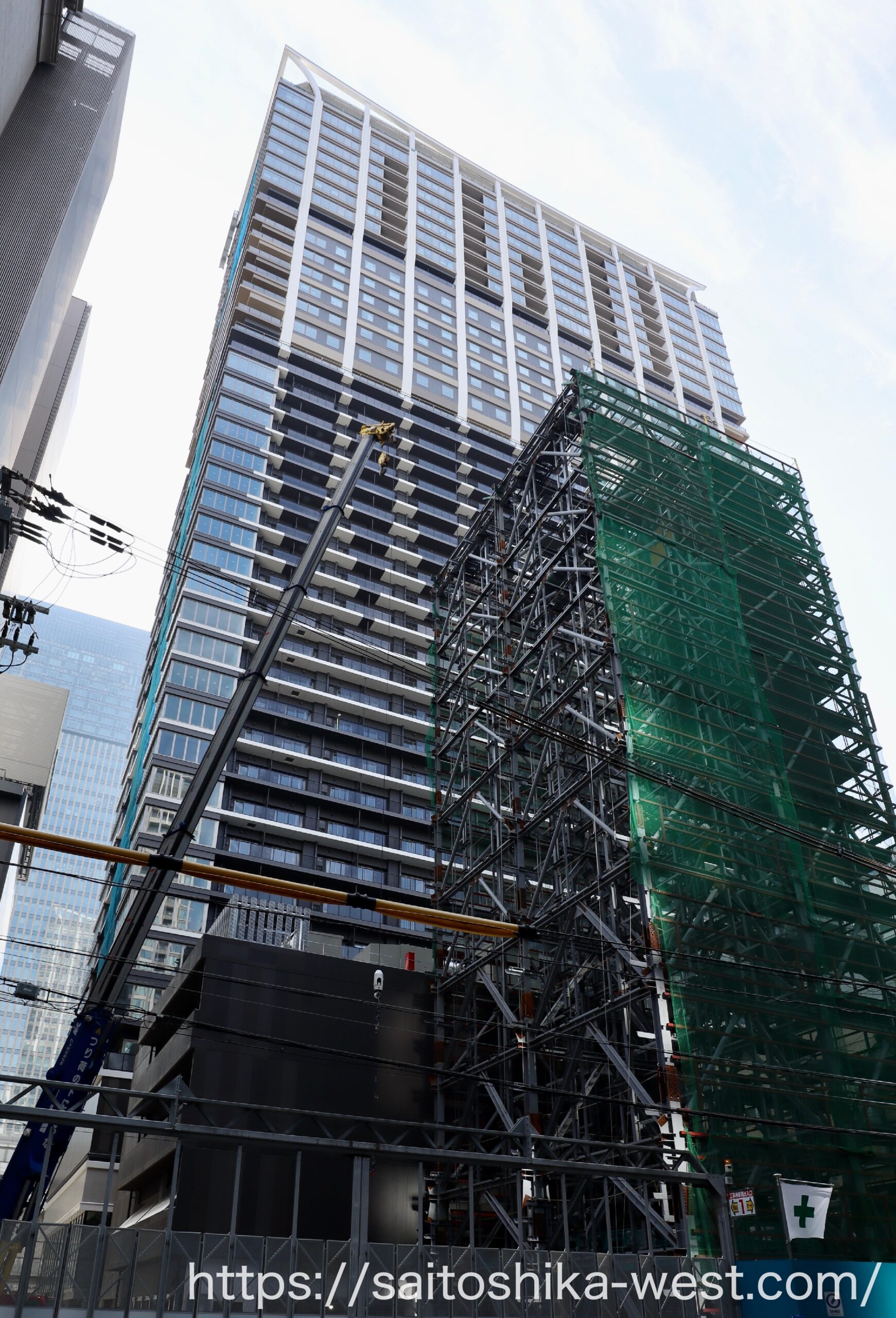 近くで見上げた様子です。低層部の防護ネットが取り払われ、外装が姿を表していました。