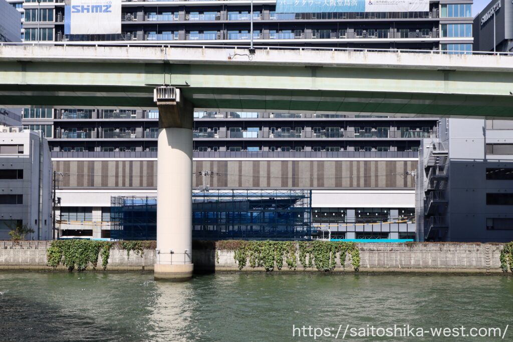 撮影ポイントを変えて、堂島川越しに見た様子です。