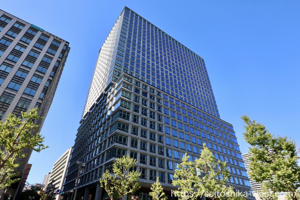 東側から見た様子です。高さ約135mの超高層ビルですが、高層部がセットバックした形状となっているため、実際の規模に比べて圧迫感が少なく、高さをあまり感じさせません。