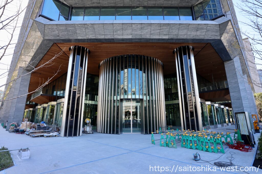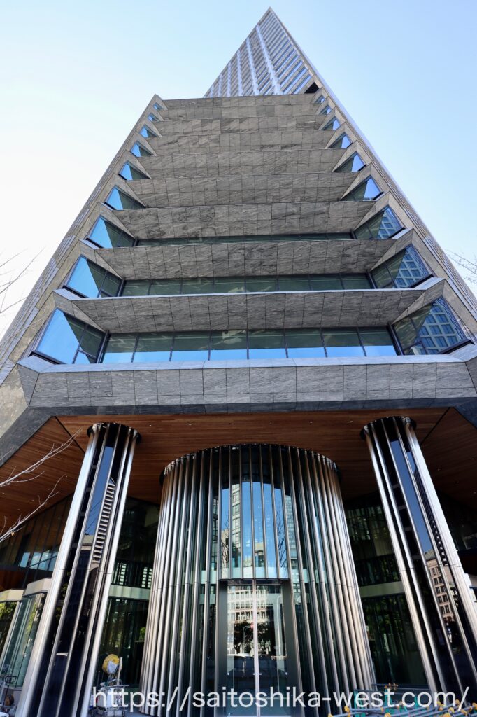 メインエントランス付近の様子です。淀屋橋交差点に面するメインエントランスには、土佐堀川の水面をイメージした鏡面マリオンとガラスウォールが設けられています。この部分のデザインや質感は圧倒的に高級で、思わず息をのむほど。他のビルと比べても、一段突き抜けた存在感を放っています。