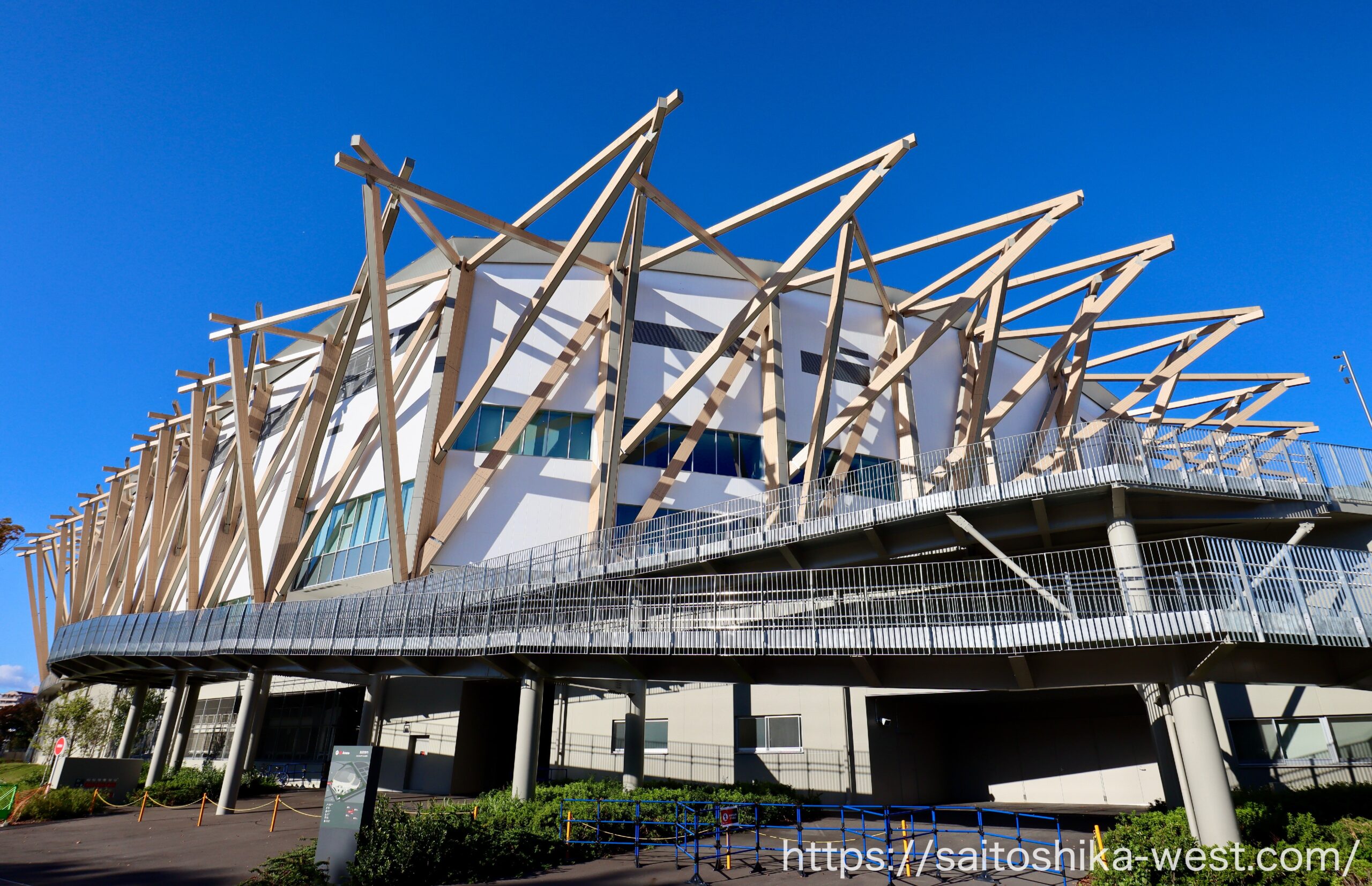 ■ 隈研吾氏によるデザイン、名城公園と調和する「樹形アーチ」:外観・内装デザインは隈研吾建築都市設計事務所が担当。名城公園の緑と連続するように設計された「樹形アーチ」と、内部の「木陰天井」が特徴です。鉄骨の側面に木板を張り、強度と温かみを両立。日中はアーチの隙間から光が差し込み、時間とともに表情が変わります。