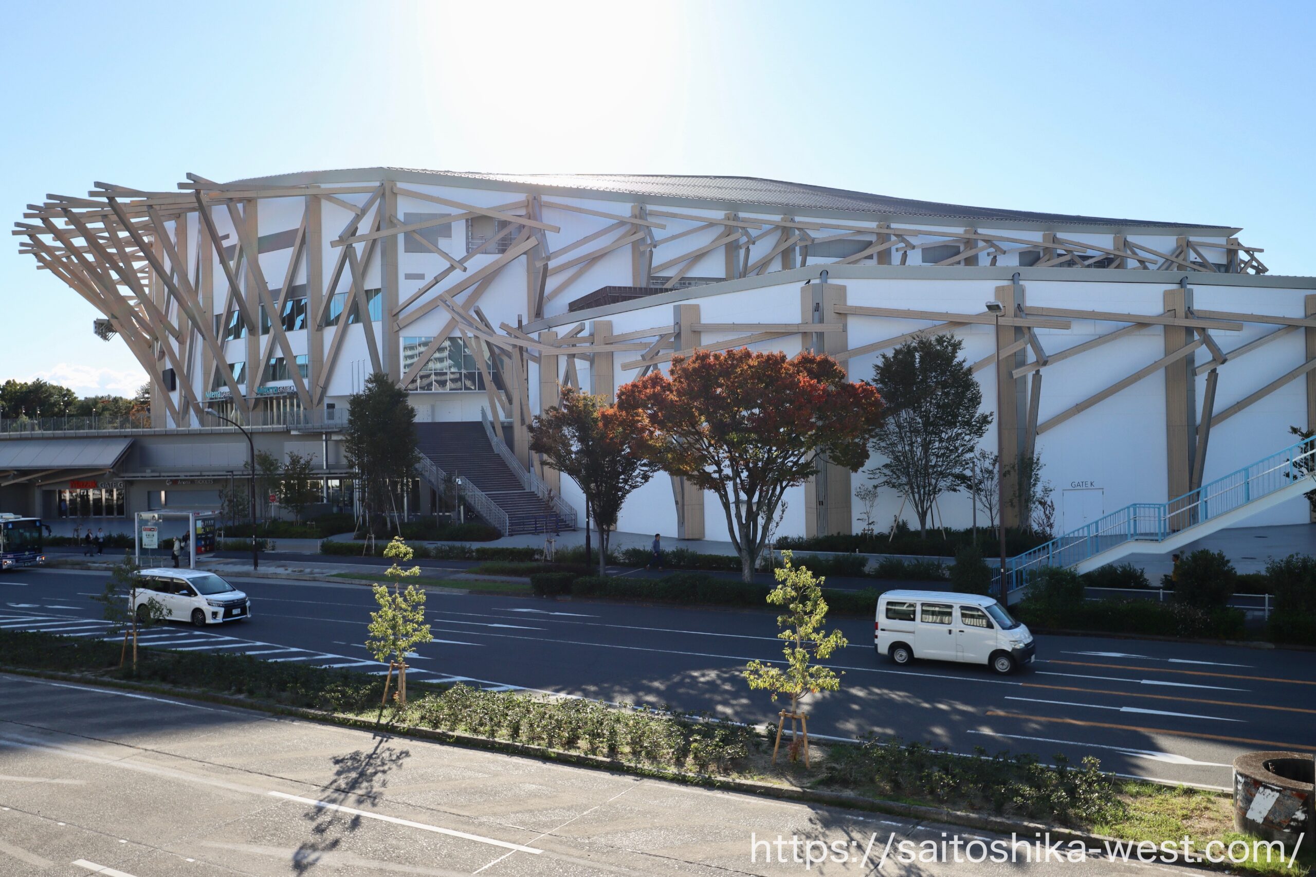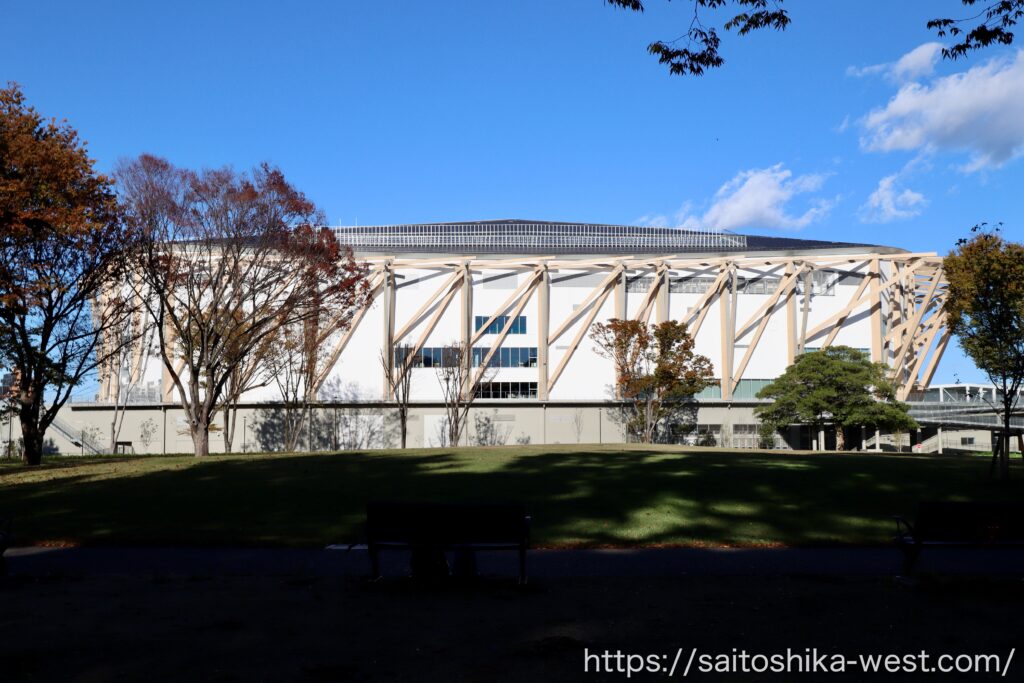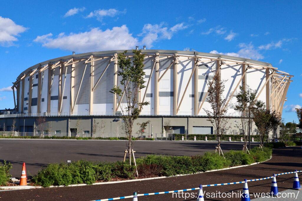 北東側から見た様子です。写真右側の青色の防護ネットがかかっている部分は「サブアリーナ」です。