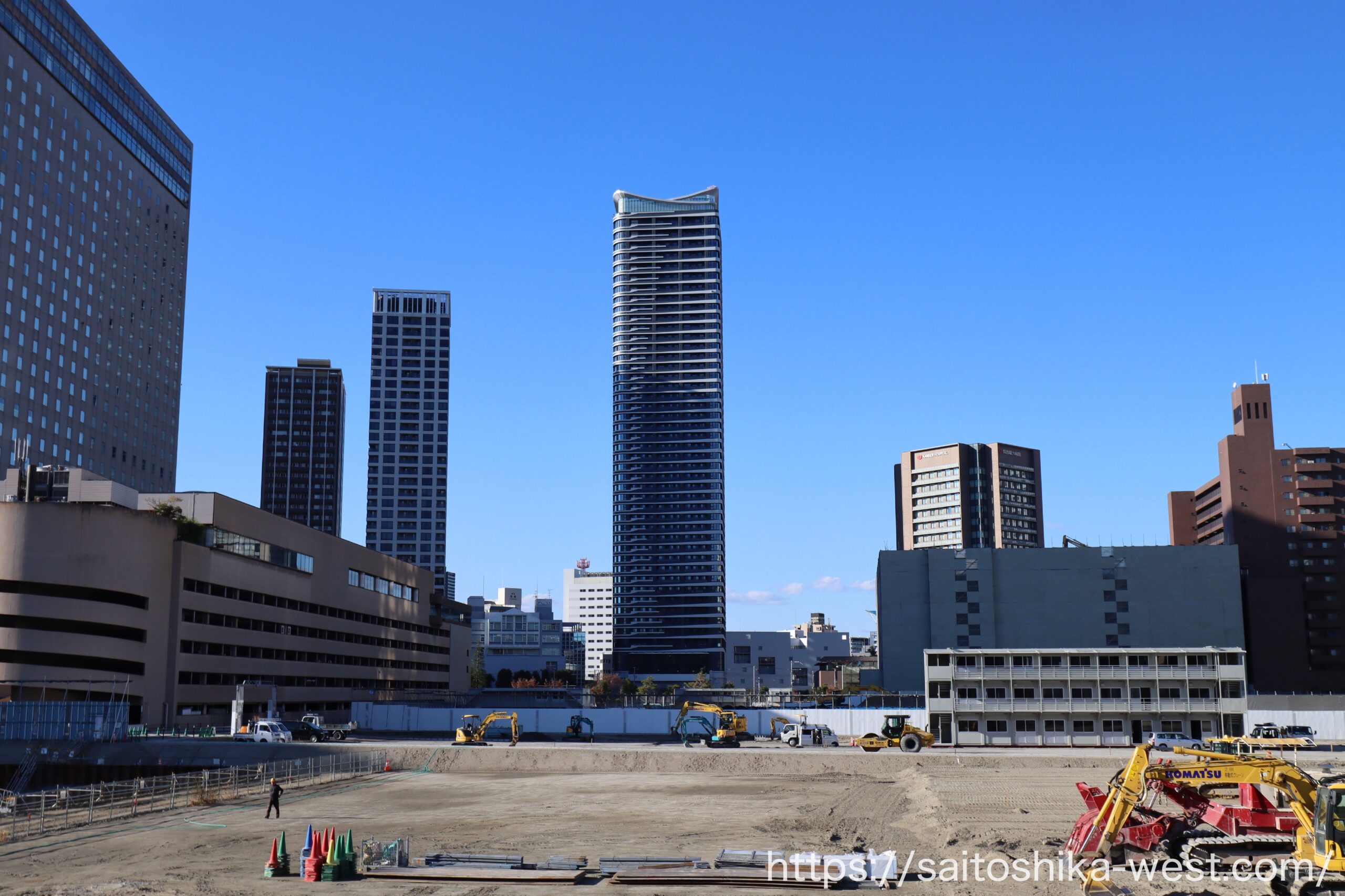 撮影ポイントを変えて、南東側から見た様子です。周辺の高層ビルとは微妙に位置と角度をずらしている事が解ります。関西電力病院の高層部が、45度の角度をつけているのは、このタワマンが建つ事を見越していたのだと思います。