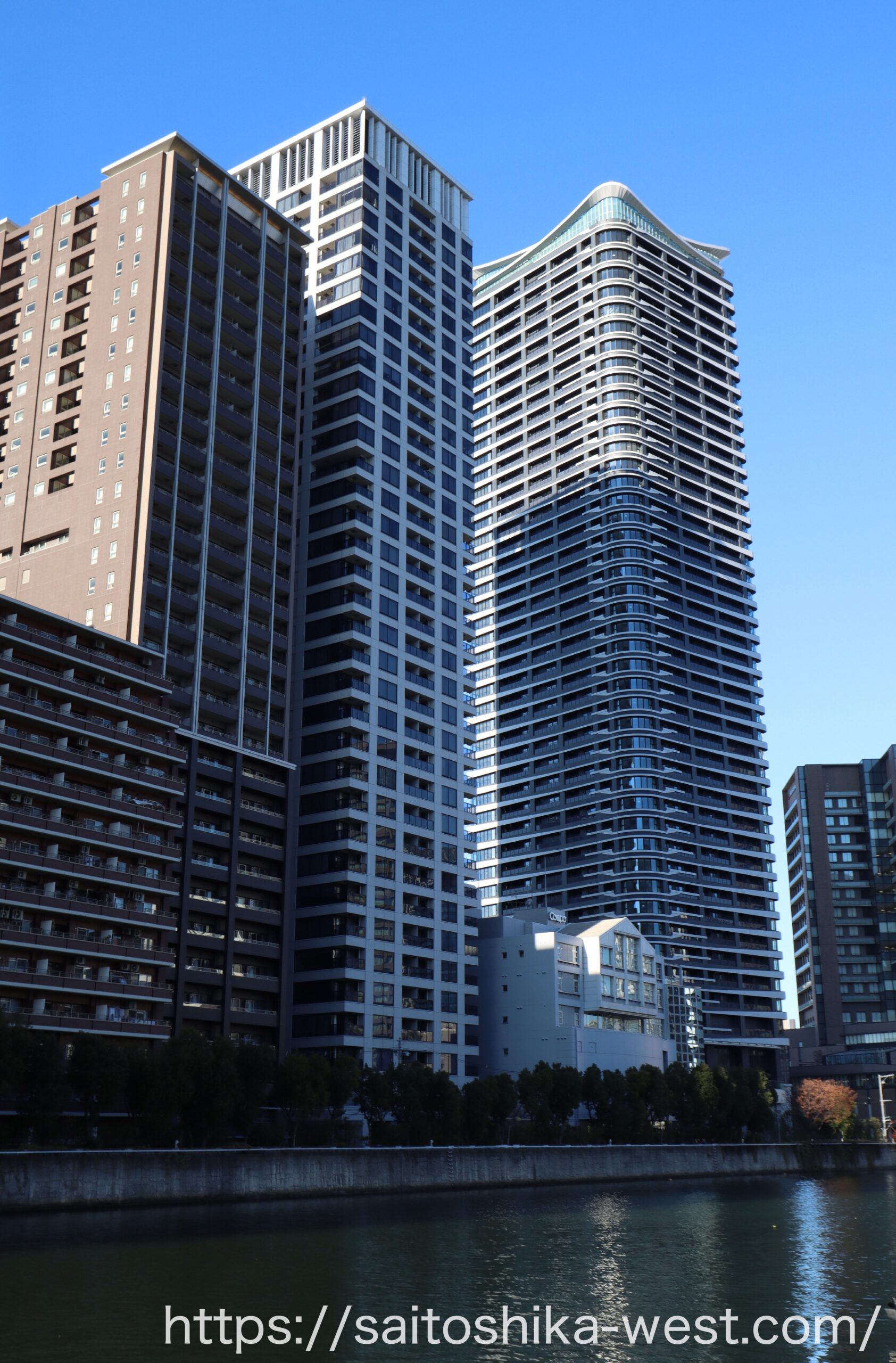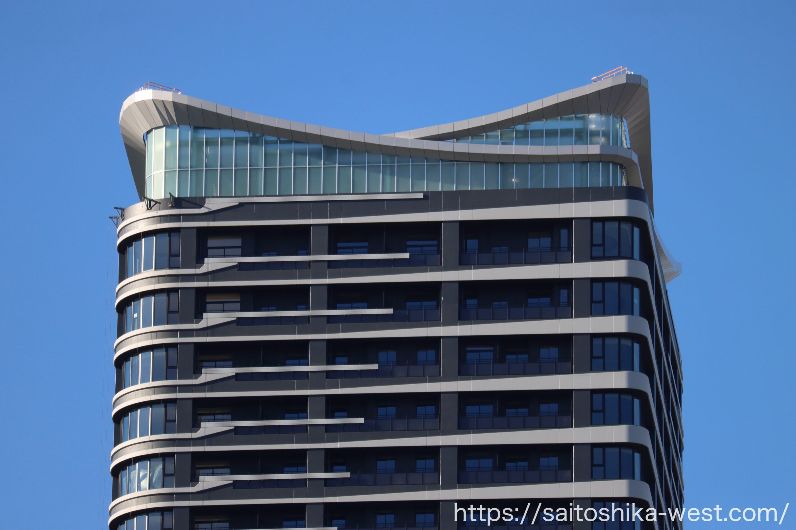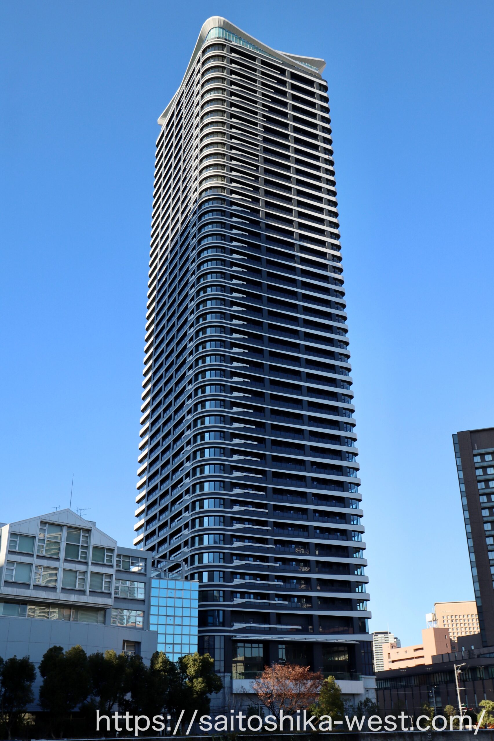 北東側から見た様子です。曲線を多用した有機的なデザインが印象的なタワーマンションで、只者ではない存在感を放っています。