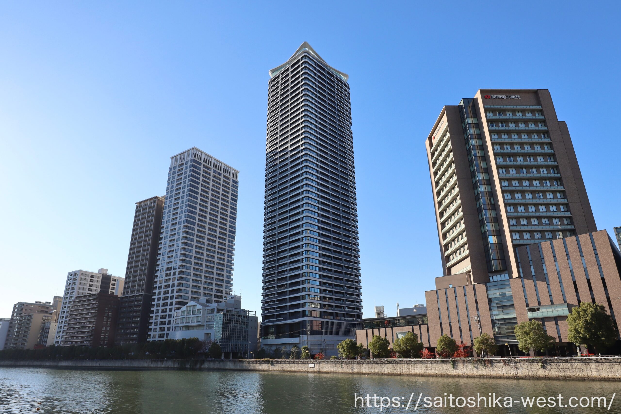 北東側から見た様子です。シエリアタワー中之島は、高さが約168mもあるので実数値以上に高く感じました。