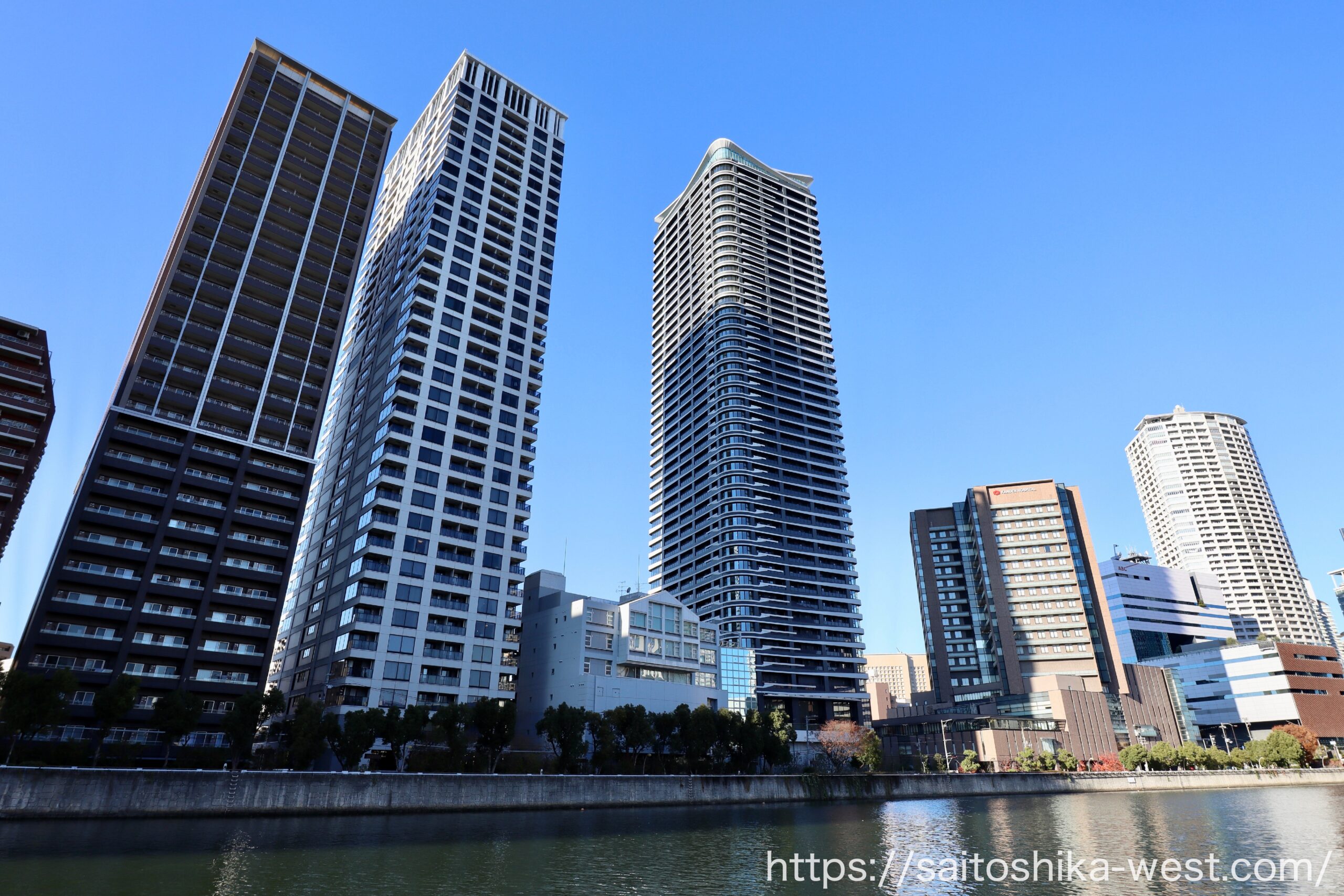 シエリアタワー中之島と周辺のタワーマンションの様子です。