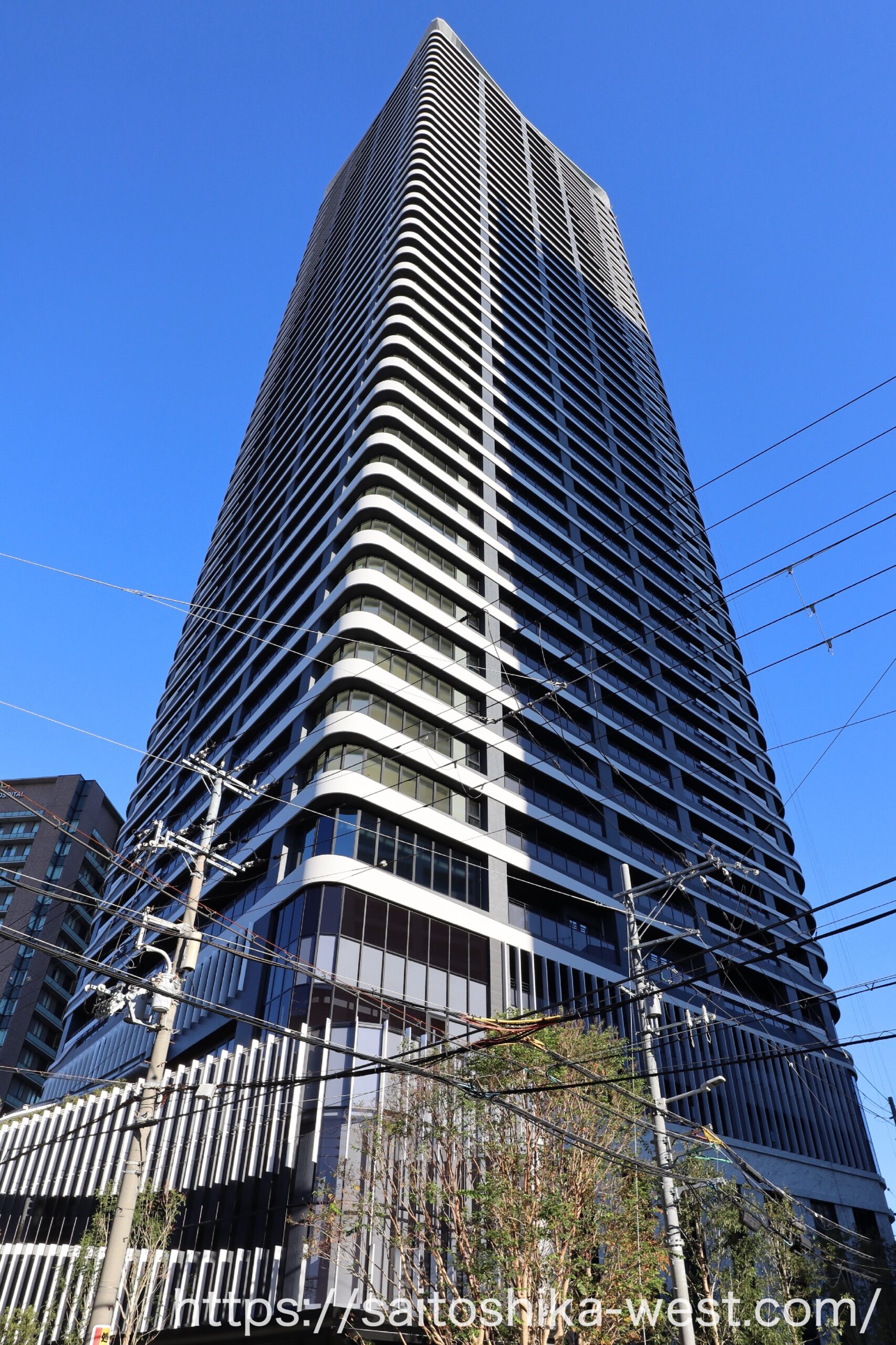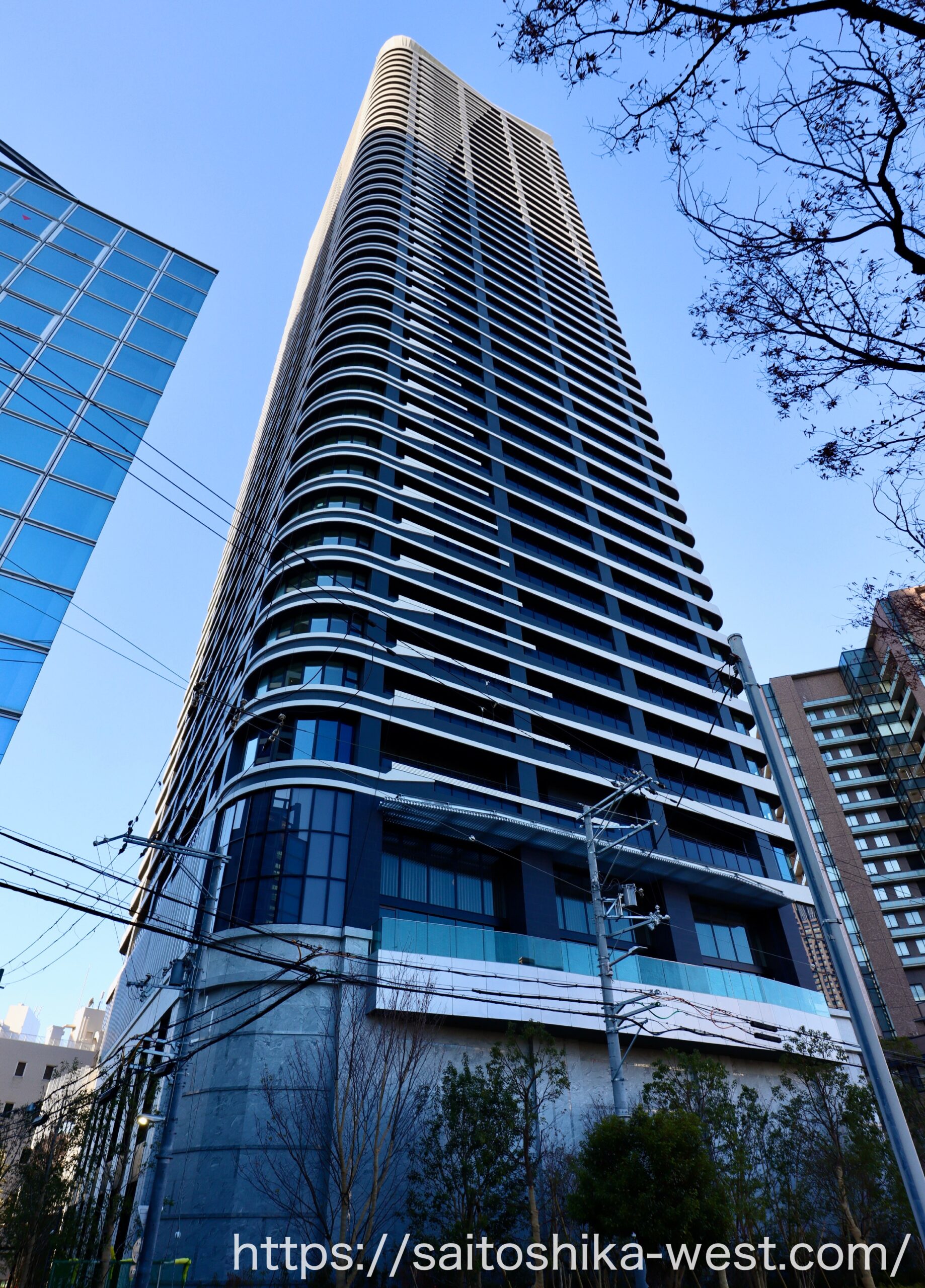 近くで見上げた様子です。有機的なデザインが高級感を醸し出しています。只者ではないオーラをまとったタワーマンションですね。