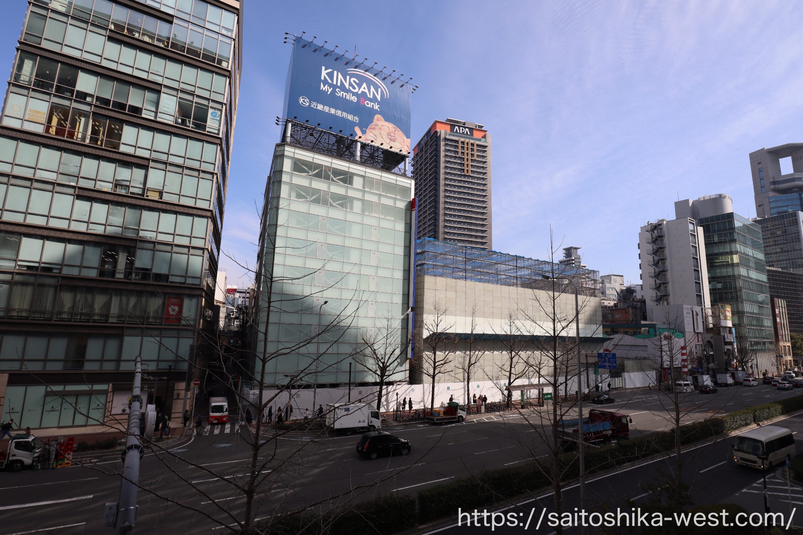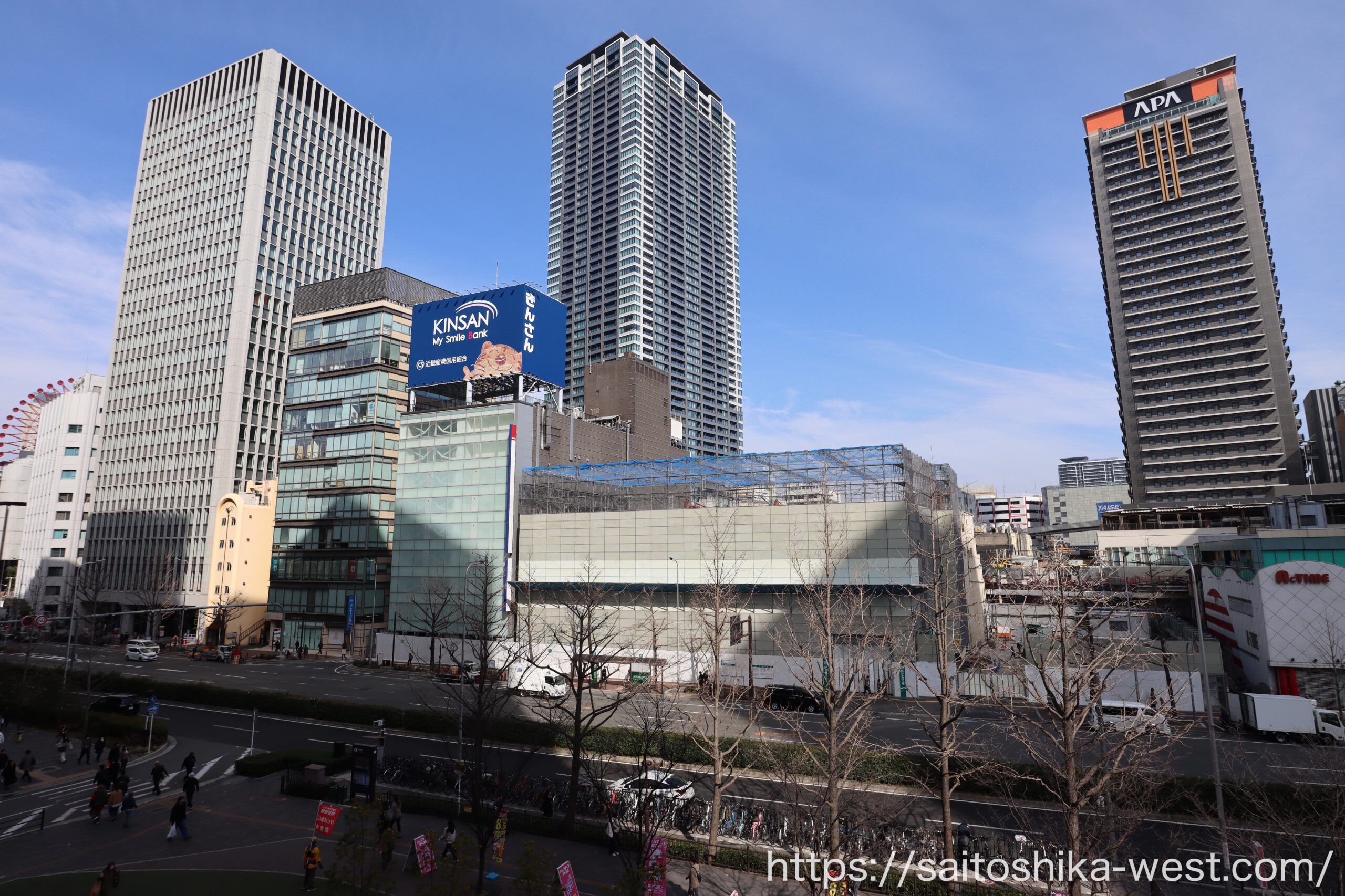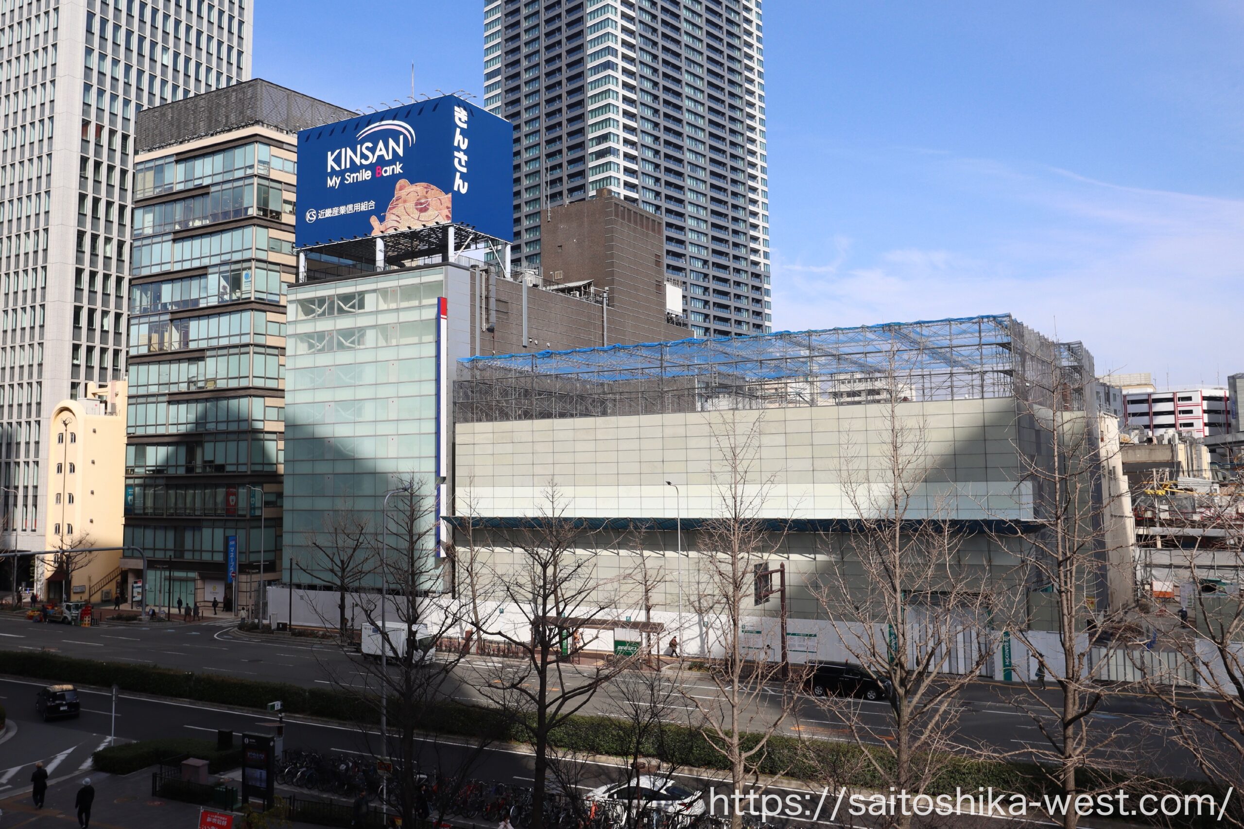最後は引き気味で見た周辺の様子です。きんさんの看板がある「梅田セントラルビル(写真左)」では、解体工事がまだ始まっておらず、再開発の本格着手までは、もうしばらく時間がかかりそうです。