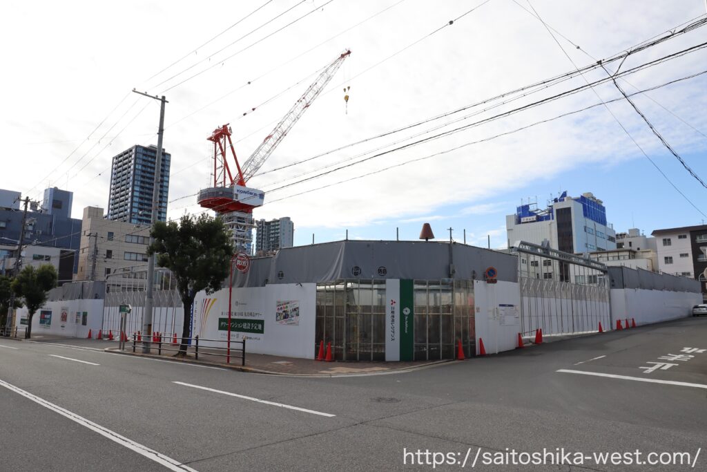 北東側から見た様子です。撮影時には解体工事(おそらく旧ビルの基礎)が行われていました。