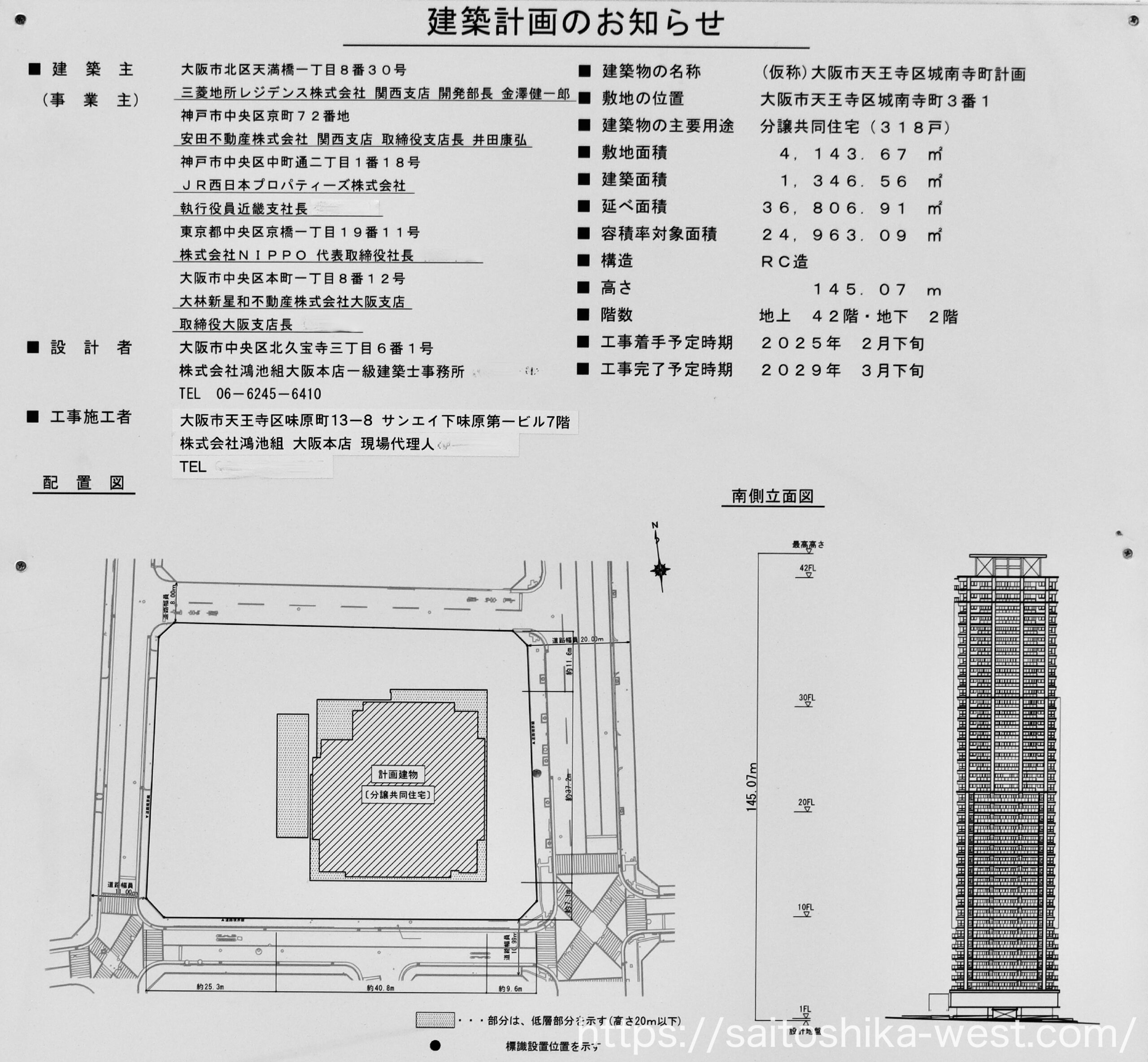 敷地面積は4,134.67㎡、延床面積は36,808.91㎡。建築主は三菱地所レジデンス、JR西日本プロパティーズ、NIPPO、大林新星和不動産の4社で、設計・監理および施工は鴻池組が担当します。2025年3月に着工、2029年3月中旬に竣工する予定です。上本町エリアの新しいランドマークタワーとして、その動向が注目されるプロジェクトです。