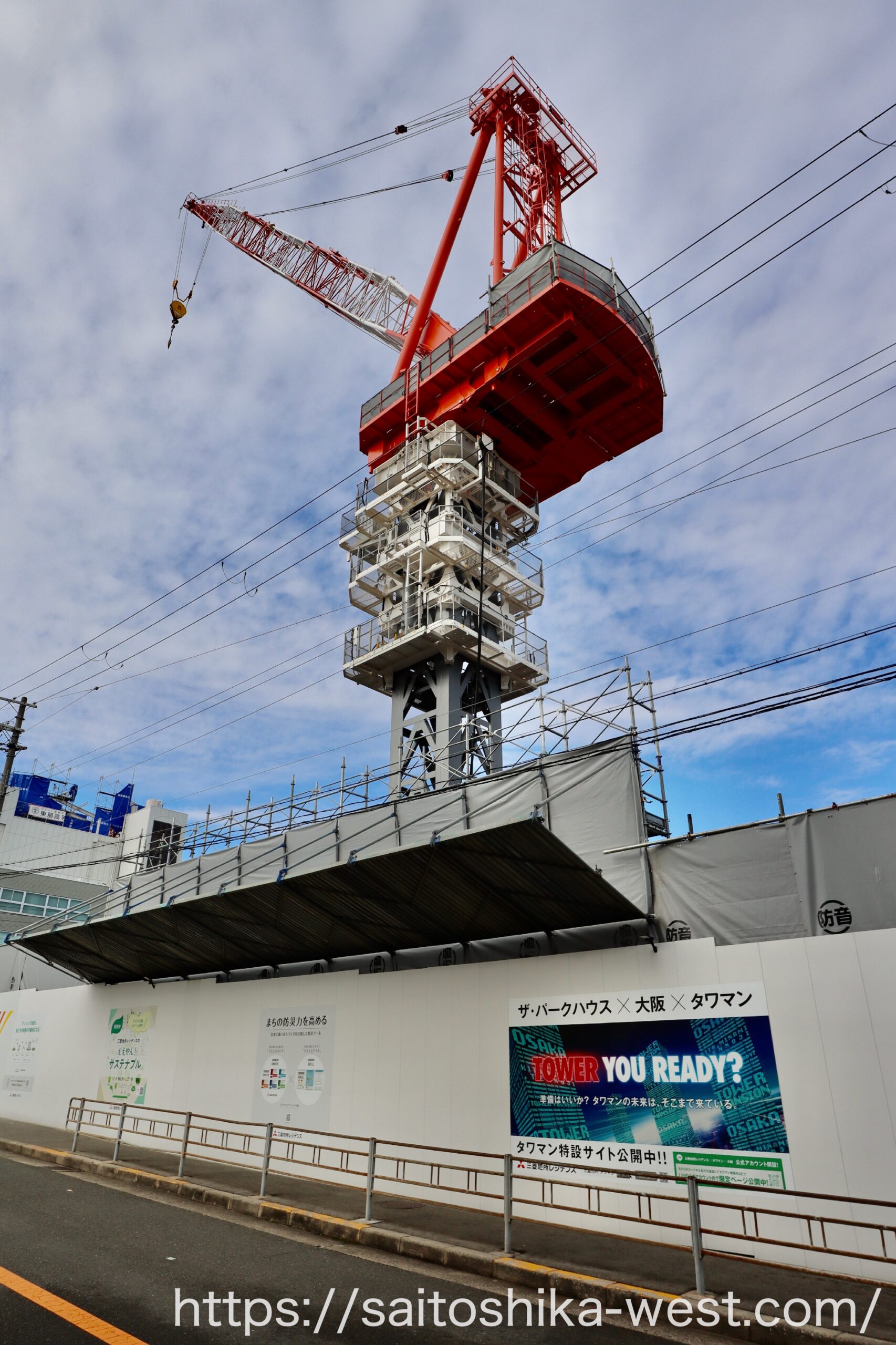 北西側から見た様子です。取材時には巨大なタワークレーン1機が稼働していました。