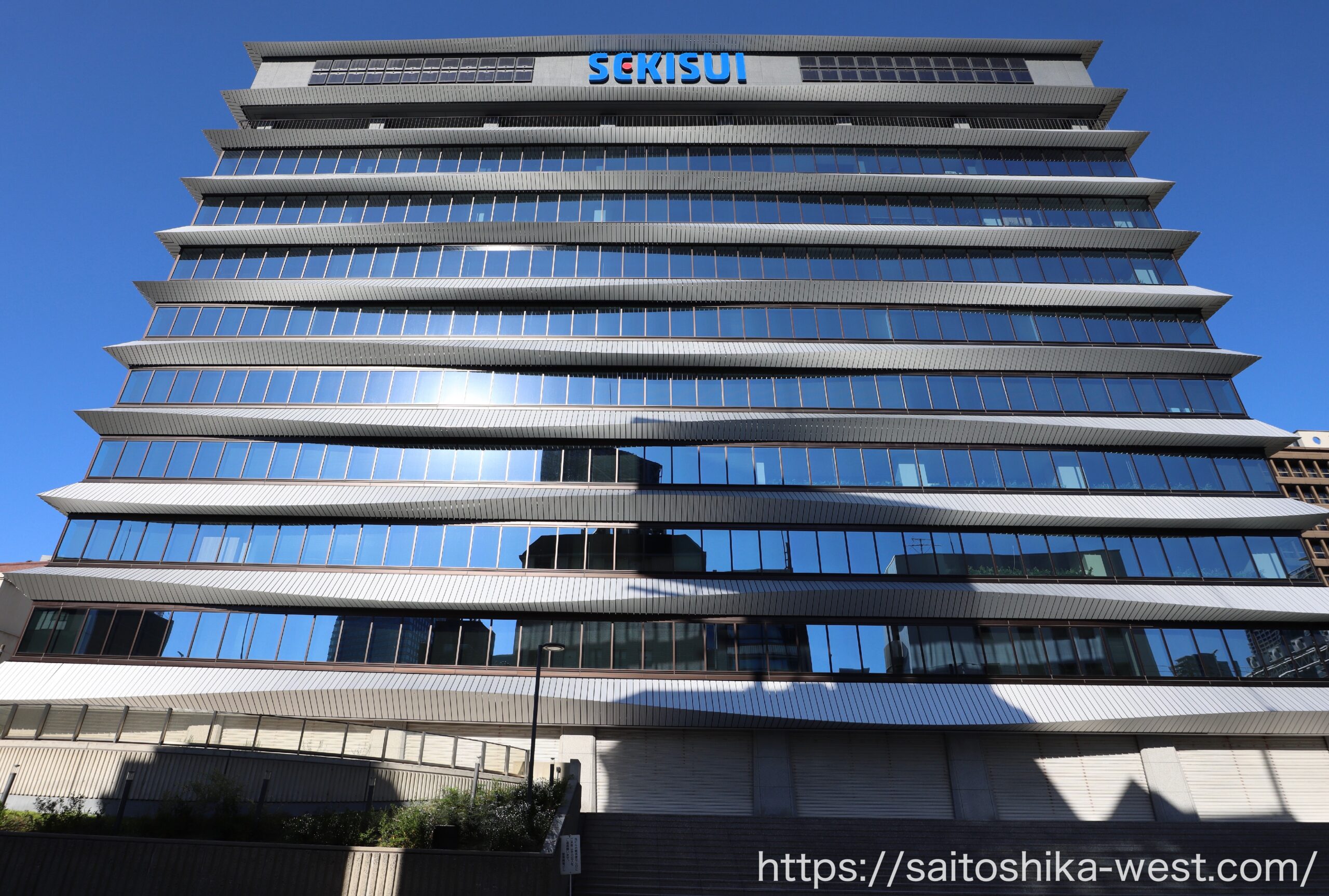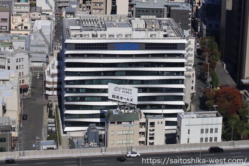 撮影ポイントを変て見た、ビルの頂部付近の様子です。「SEKISUI」のロゴマークが姿を表していました!