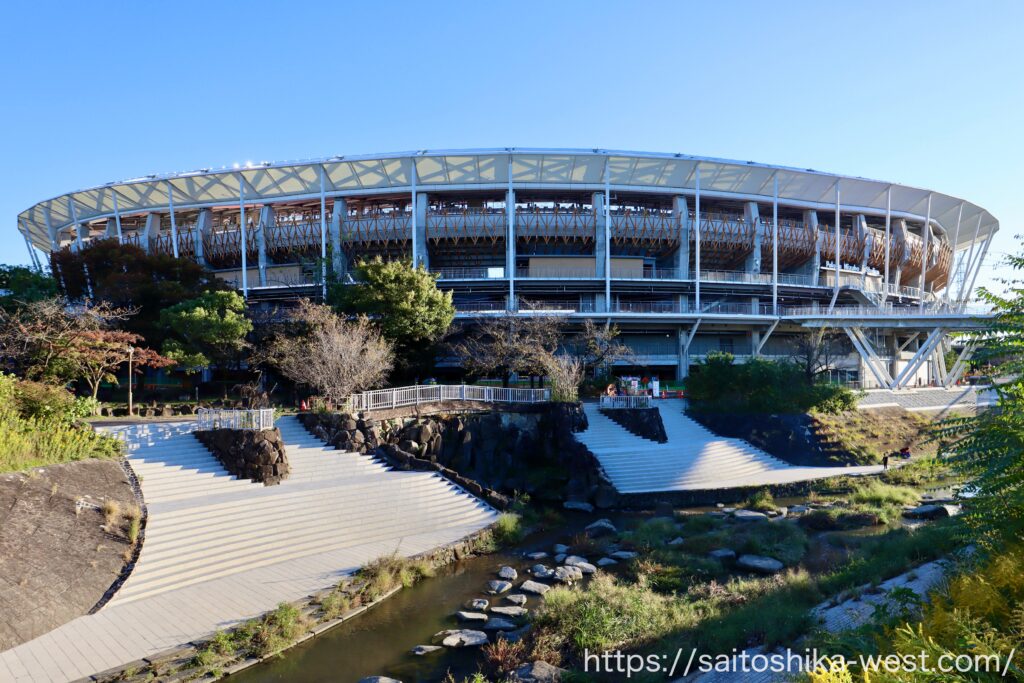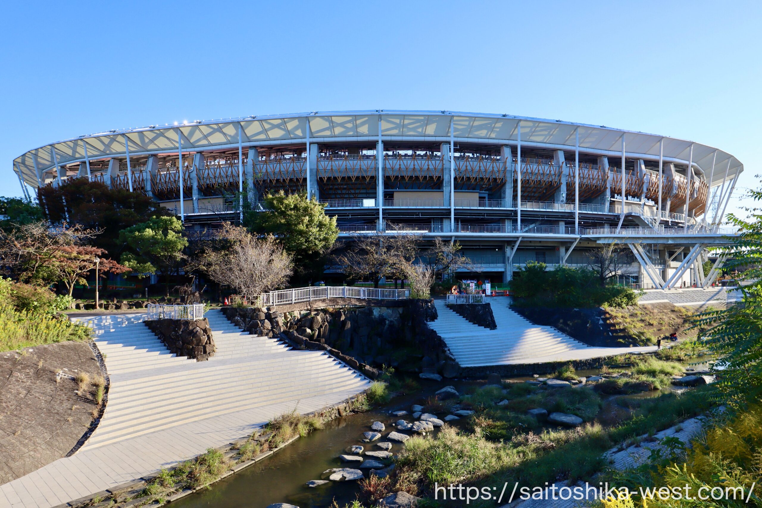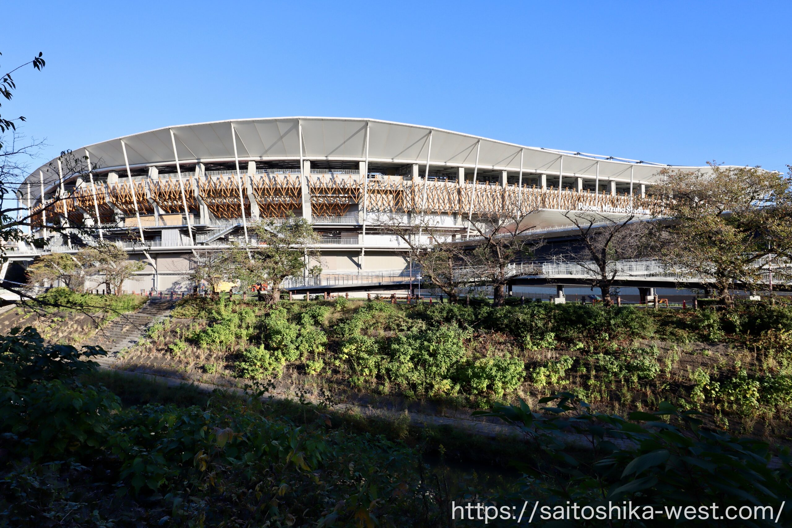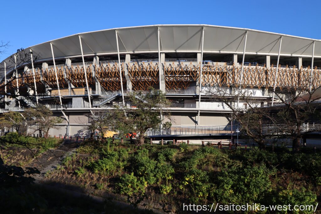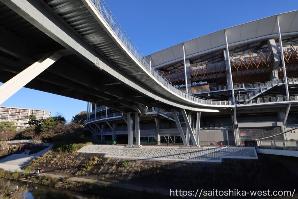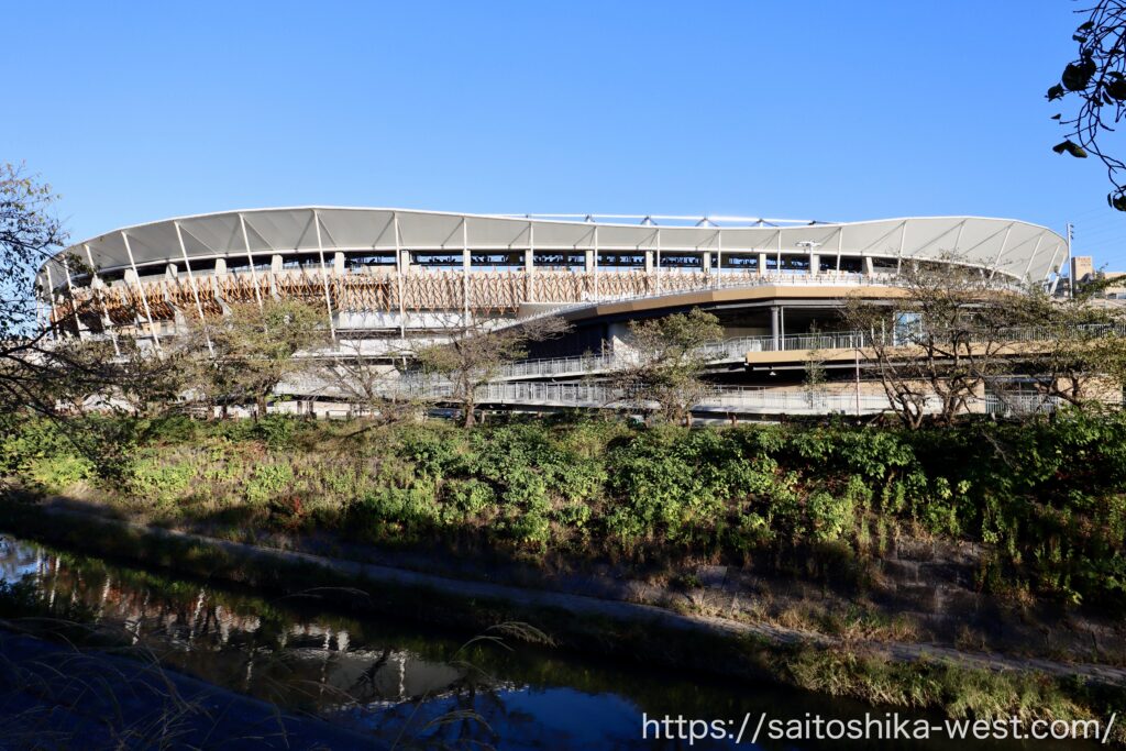 最後は山崎川越しに見た様子です。このあたりは開けているので、スタジアムの全体像が把握しやすかったです。この川を挟んで「八の字ループ」を描く歩行者デッキが整備されます。