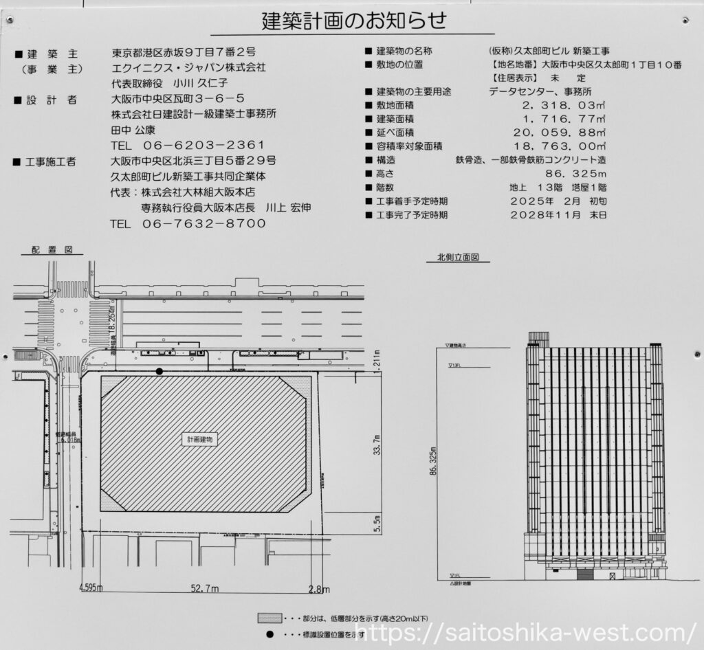 (仮称)久太郎町ビル新築工事は、堺筋本町駅の東側、中央大通り沿いにあったコインパーキングの跡地。新ビルは、鉄骨造、地上15階、塔屋1階、高さ97.865m。敷地面積:2,399.36㎡、建築面積:1,714.14㎡、延床面積:23,253.21㎡。建築主はエクイニクス・ジャパン、設計者は日建設計、施工者は未定です。2025年02月初旬に着工し、2027年03月中旬に竣工する予定です。