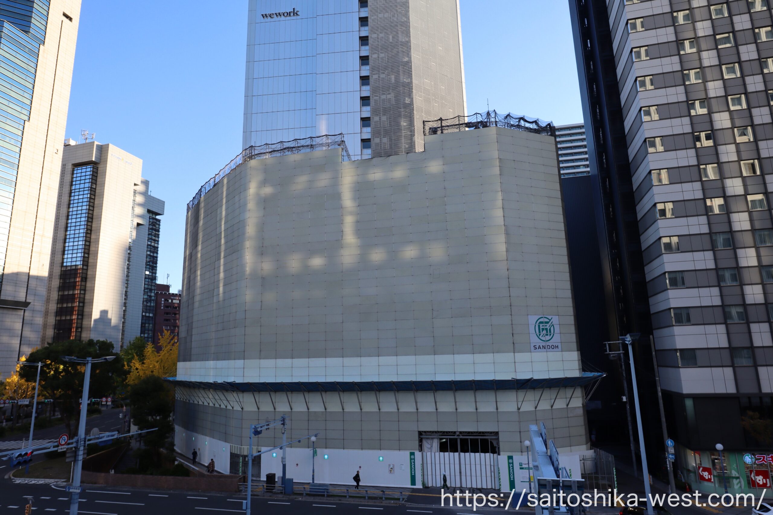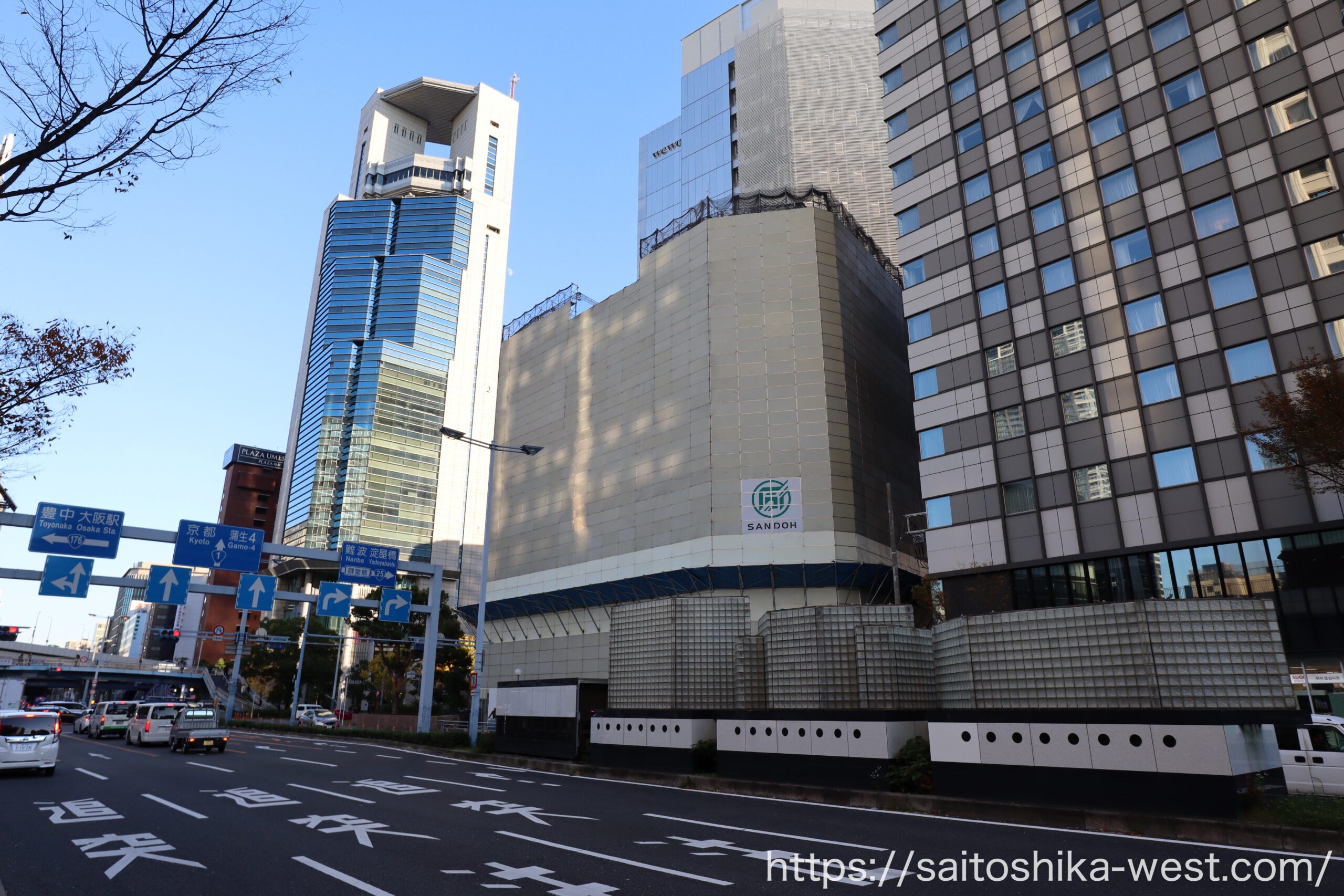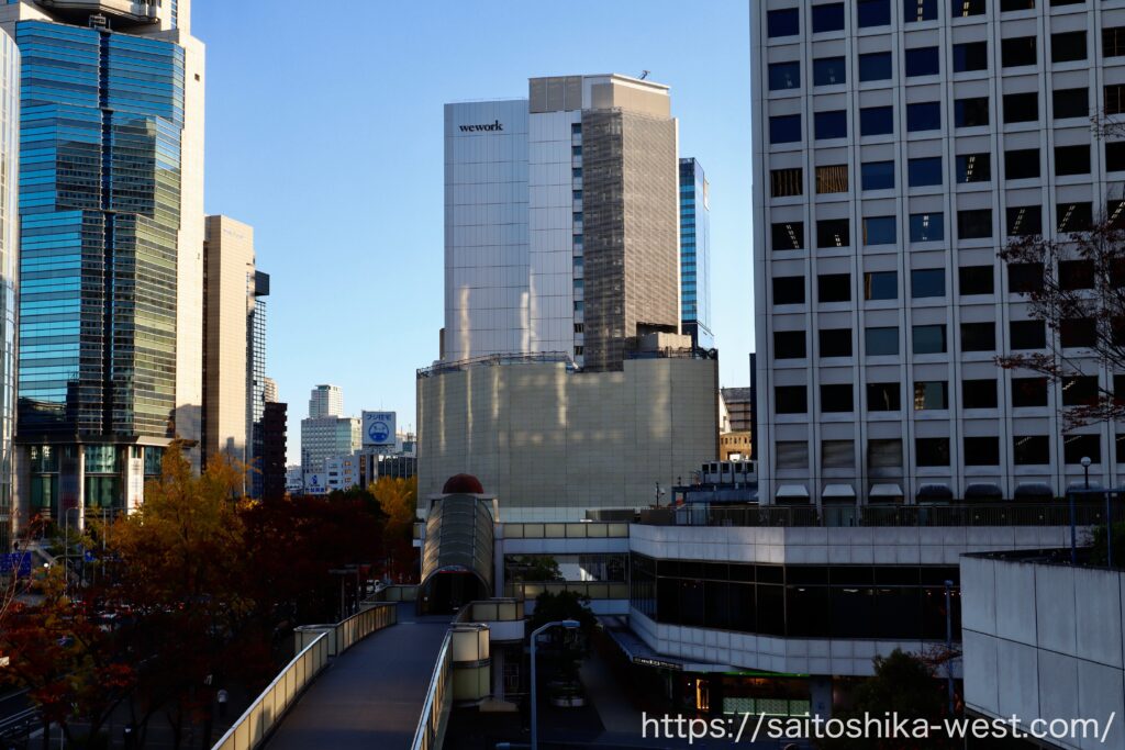 引き気味で見た様子です。『(仮称)サムティ北区曽根崎新地1丁目ビル新築工事』が完成すれば、フェニックスタワーを中心に高層ビルが集積するエリアとなり、より引き締まった都市景観が形成されることが期待されます。