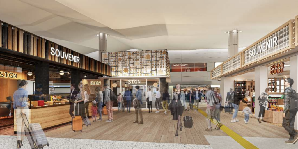 免税店は約240㎡から約700㎡へと3倍に拡大され、出国動線に沿ったウォークスルー型店舗を導入。移動しながら買い物ができる仕組みとすることで、国際線利用者の利便性と購買意欲を高め、空港収益の強化につなげます。