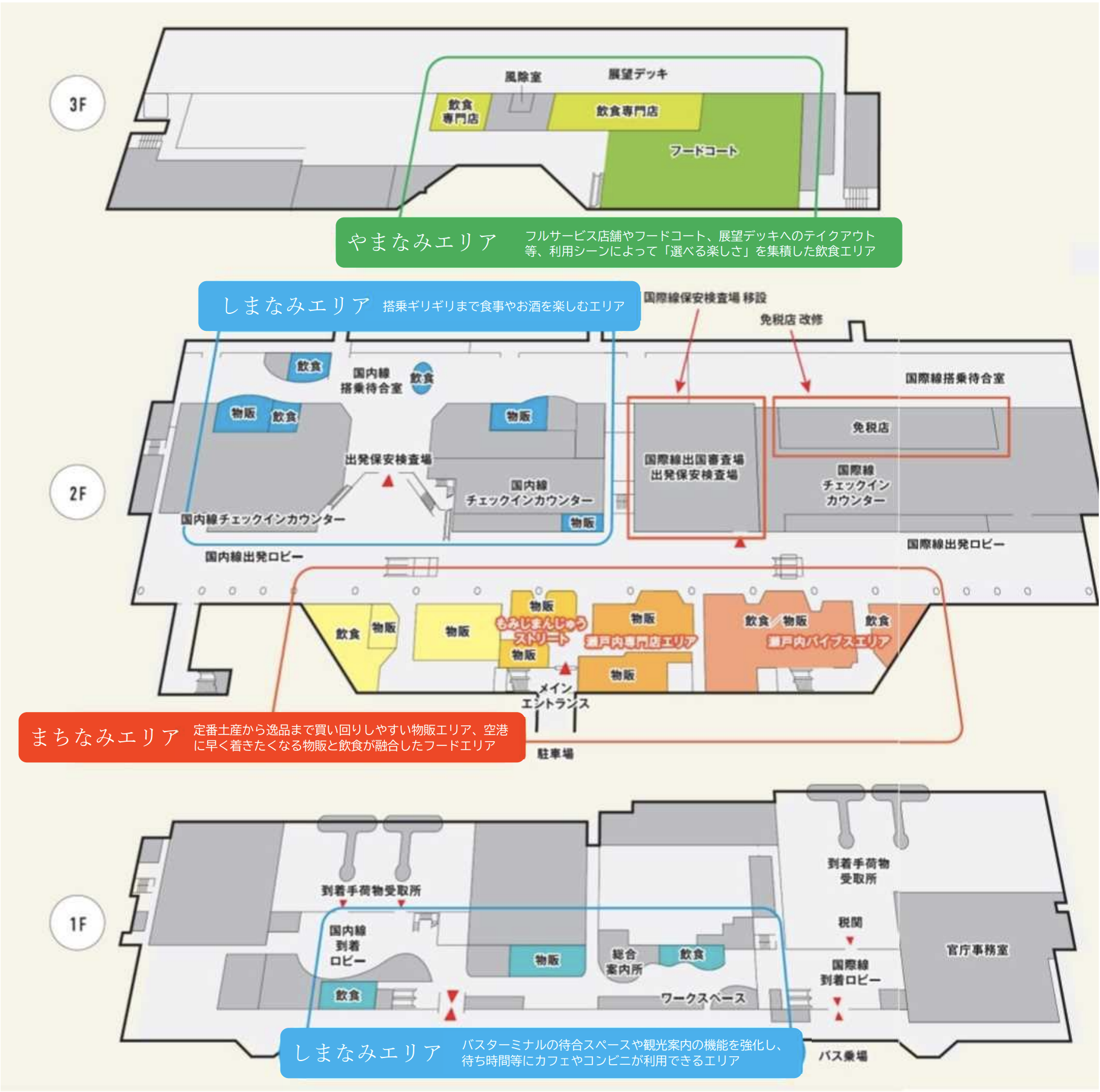 商業エリアは「しまなみ」「まちなみ」「やまなみ」の3ゾーンに再編され、店舗数は25から約40へと拡大します。地域色を反映した構成とすることで、利用者が空港内で広島や瀬戸内の魅力を体験できるよう設計されています。フードコートも広々とした空間に刷新され、家族連れからビジネス客まで幅広く対応します。