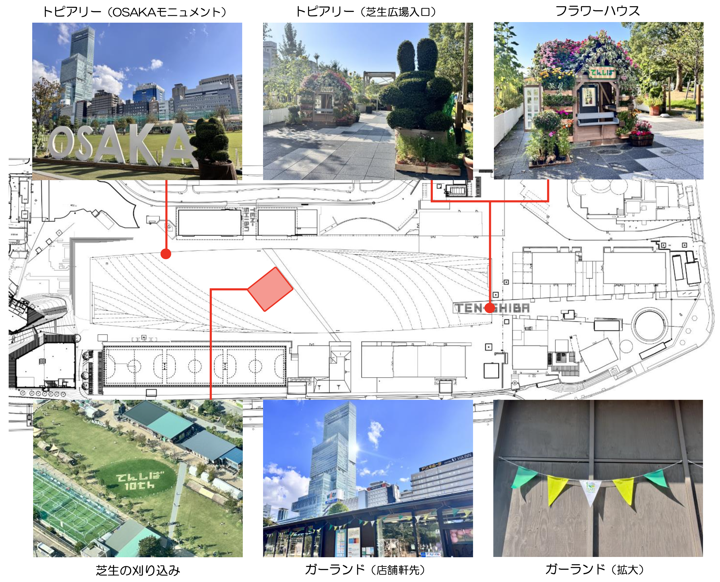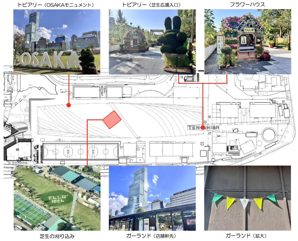 10周年を迎えたてんしばでは、芝生に「てんしば10th」の文字を刈り込み、あべのハルカス展望台から見える演出をはじめ、動物型トピアリーや記念メニューなど多彩な取り組みが行われています。華やかな装飾と同時に、日常的に訪れる人々に特別な体験を提供する工夫でもあります。