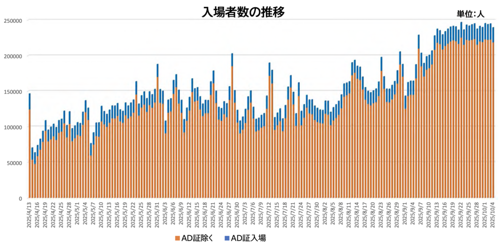 協会発表によれば、黒字の柱となったのは 入場券収入です。10月3日時点で販売枚数は2206万枚に達し、収支均衡ラインとされた1800万枚を大きく突破。これにより約200億円の増収が実現しました。最終目標とされた2300万枚には届かない可能性がありますが、黒字確保には十分な水準です。
