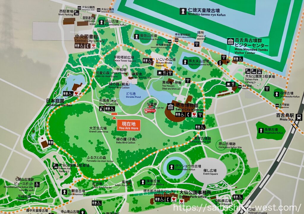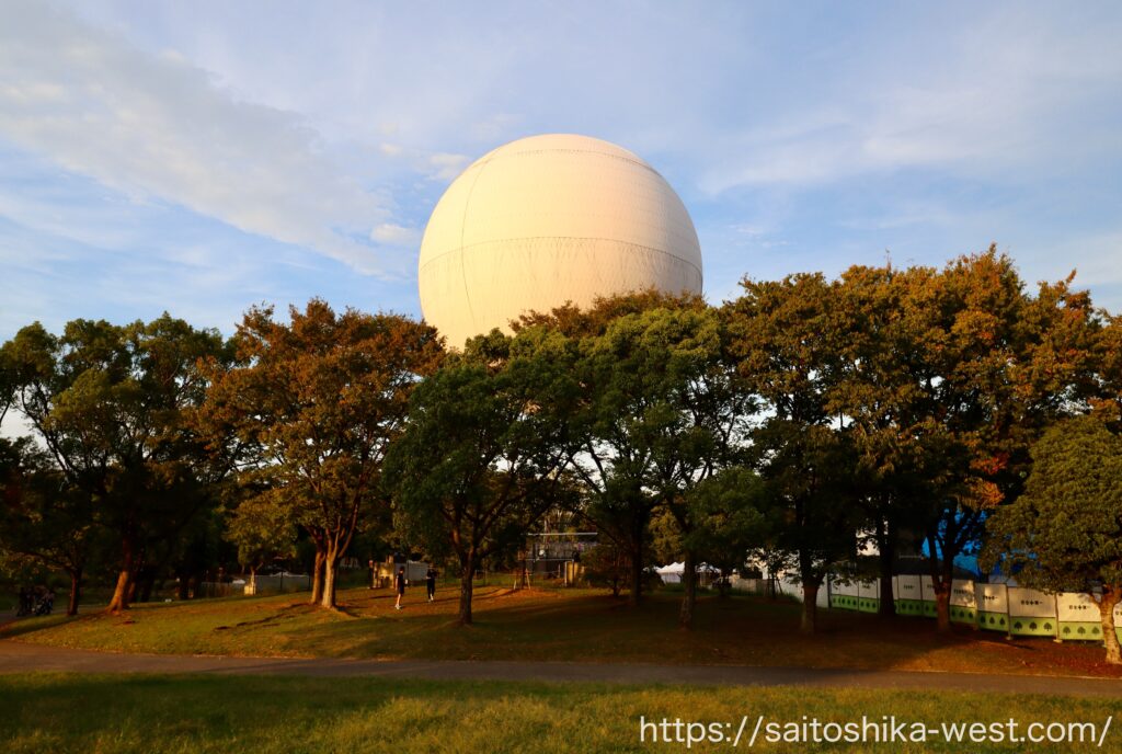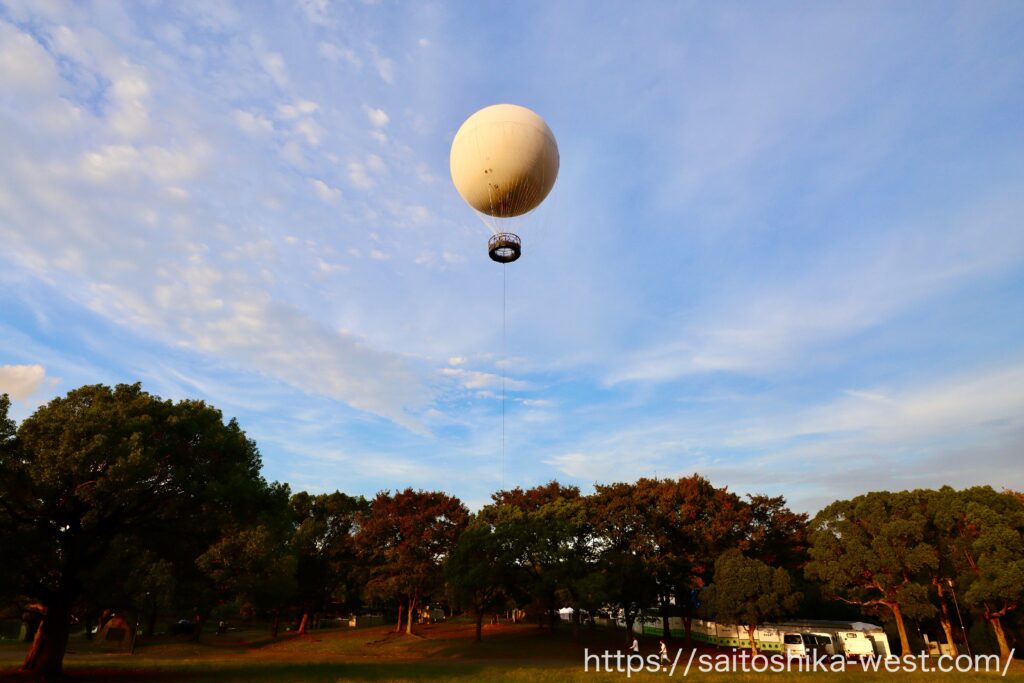 観光気球『おおさか堺バルーン』に乗って見たくて、大仙公園までやってきました!気球の場所は写真の中央付近、「どら池」の真ん中下ぐらいにあります。JR阪和線・百舌鳥駅から徒歩6〜7分、駐車場は「大仙公園第3駐車場」が近いです。