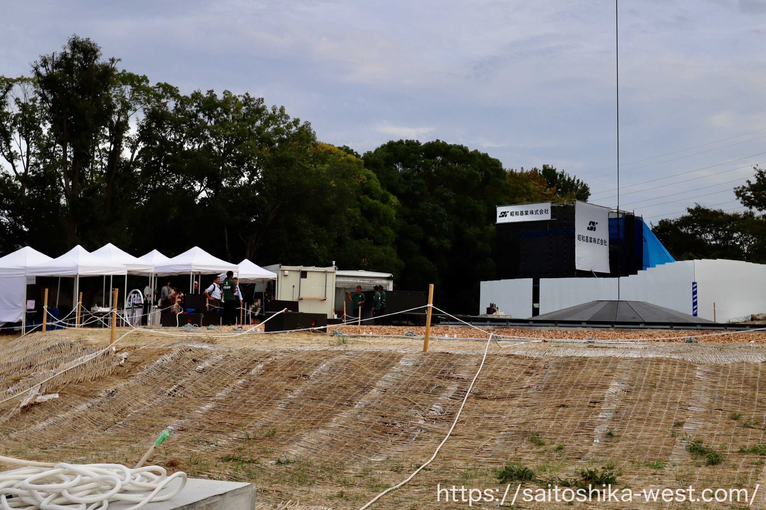 チケット売り場は現在は仮設で運営されており、隣接地(写真右奥)では観光案内所の建設が進められています。