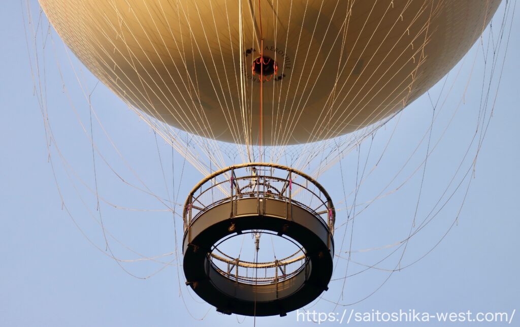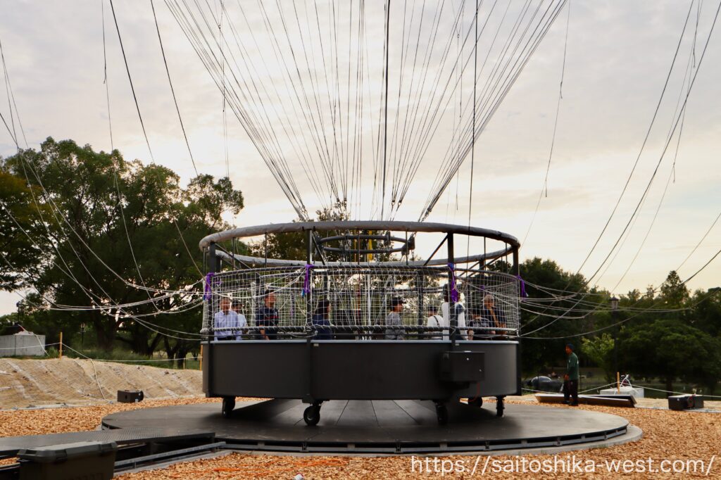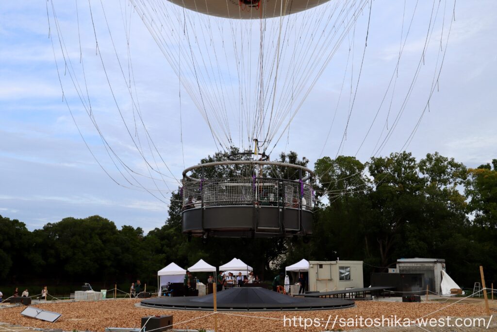 ゴンドラに乗り込みました!気球と地上は鋼鉄製のワイヤーロープでつながっています。天空の城ラピュタのタイガーモス号の上にある、パズーとシータが乗っていたグライダーのワイヤーにソックリで思わずニンマリ。