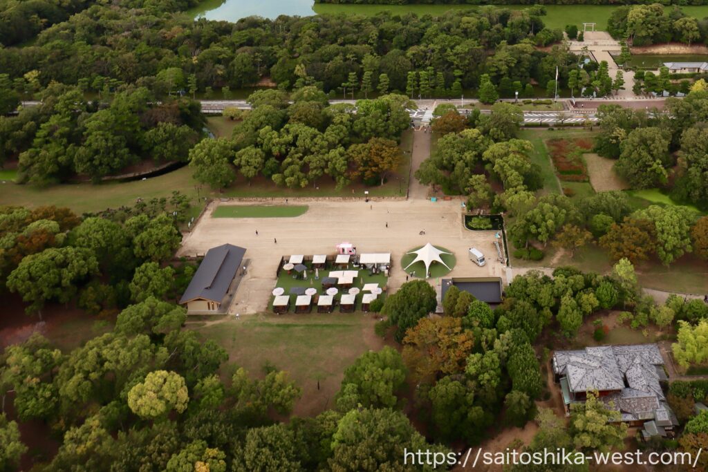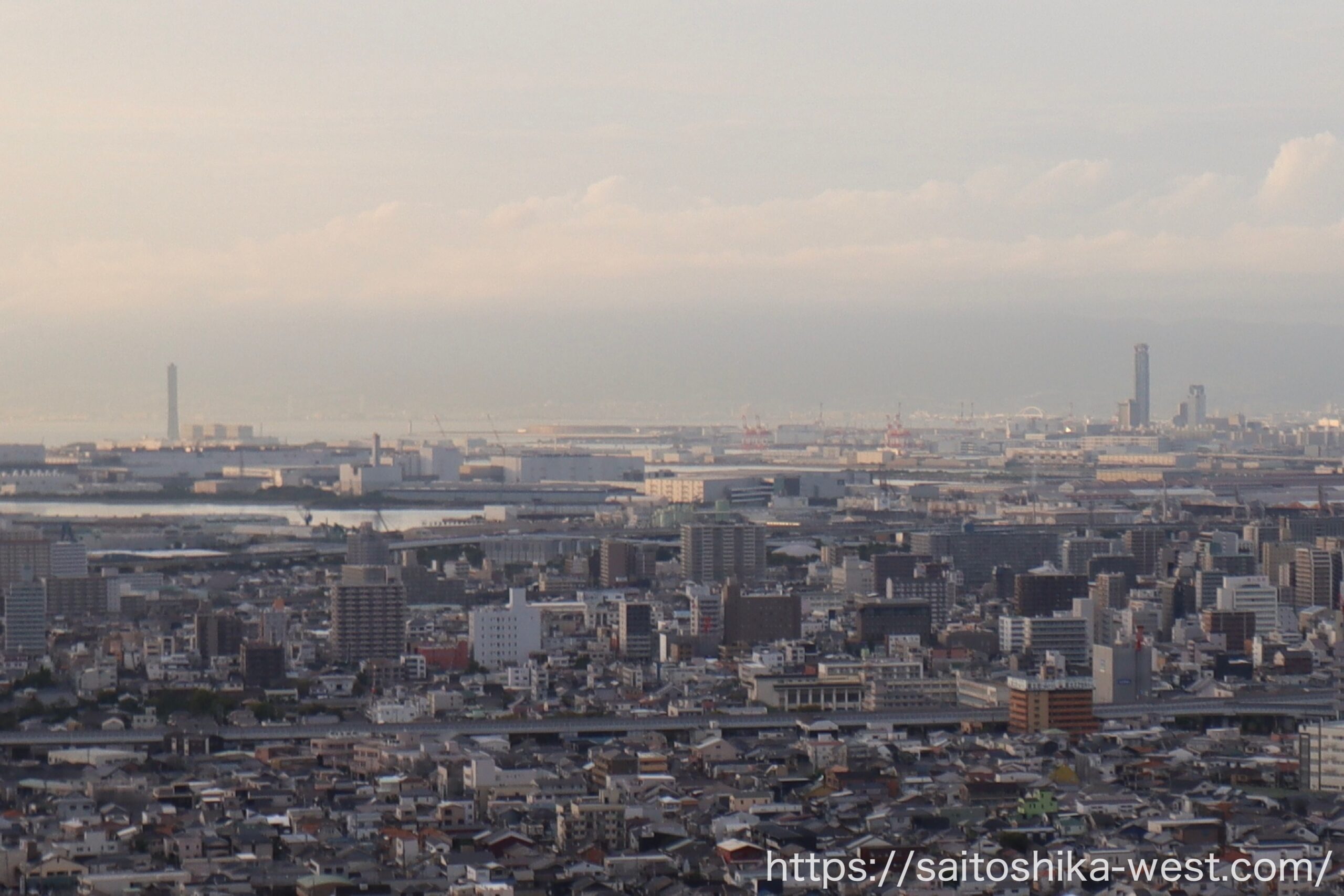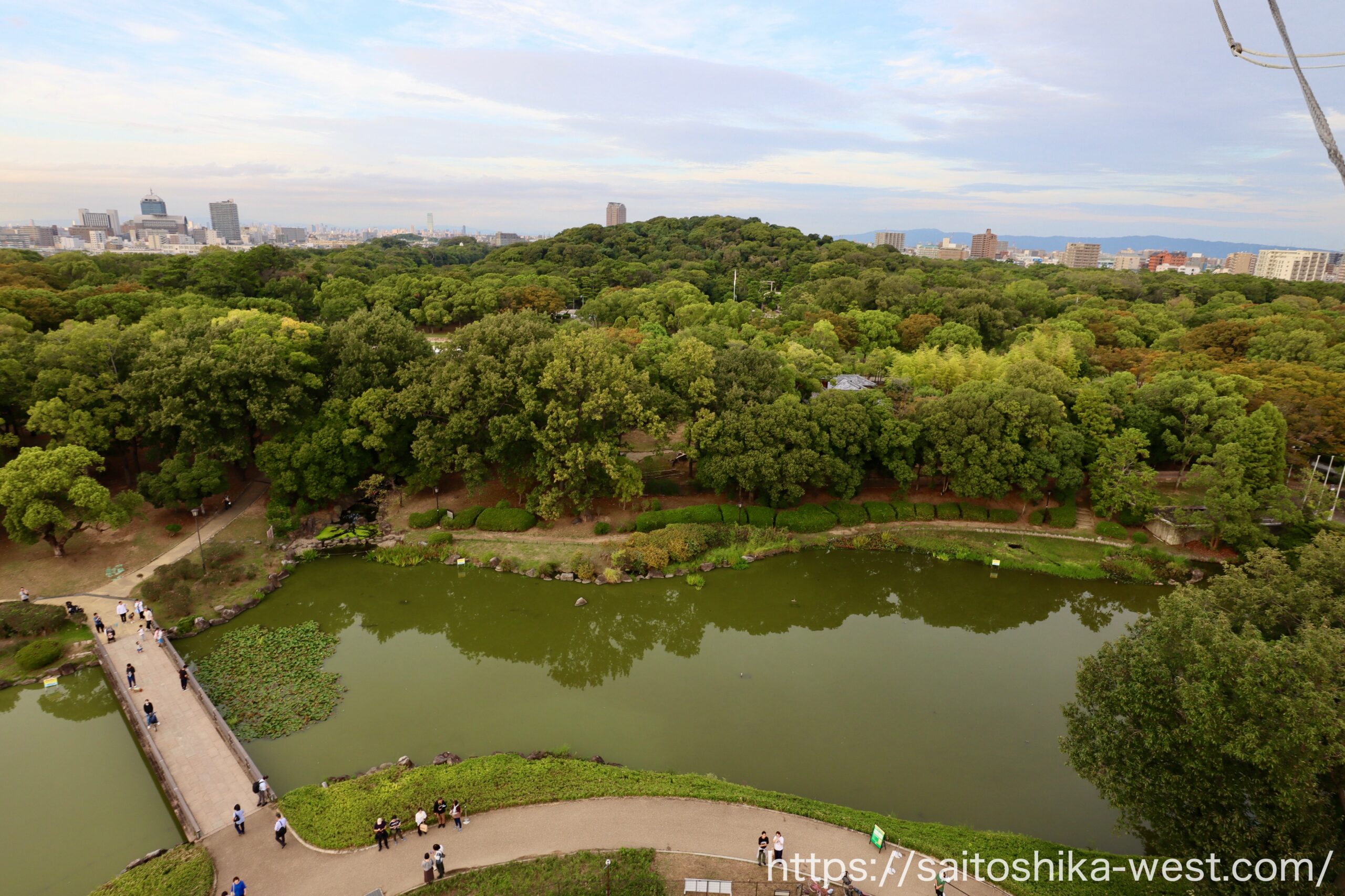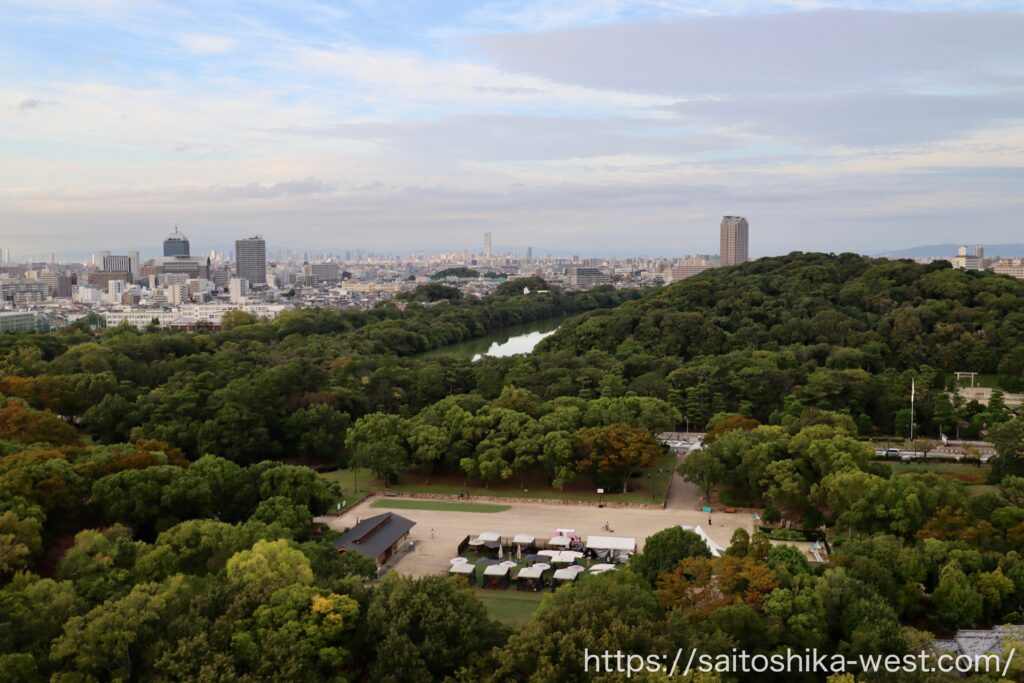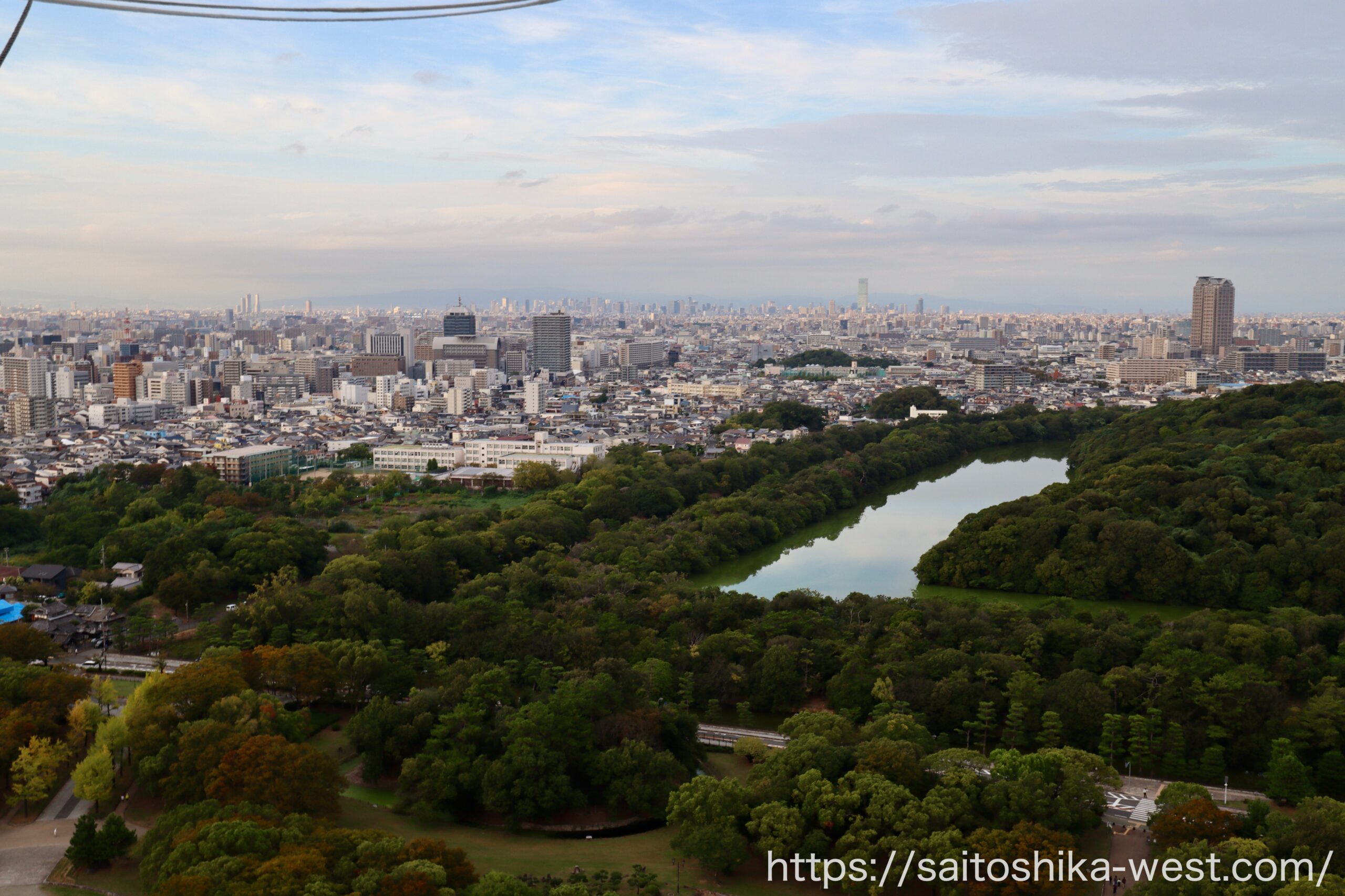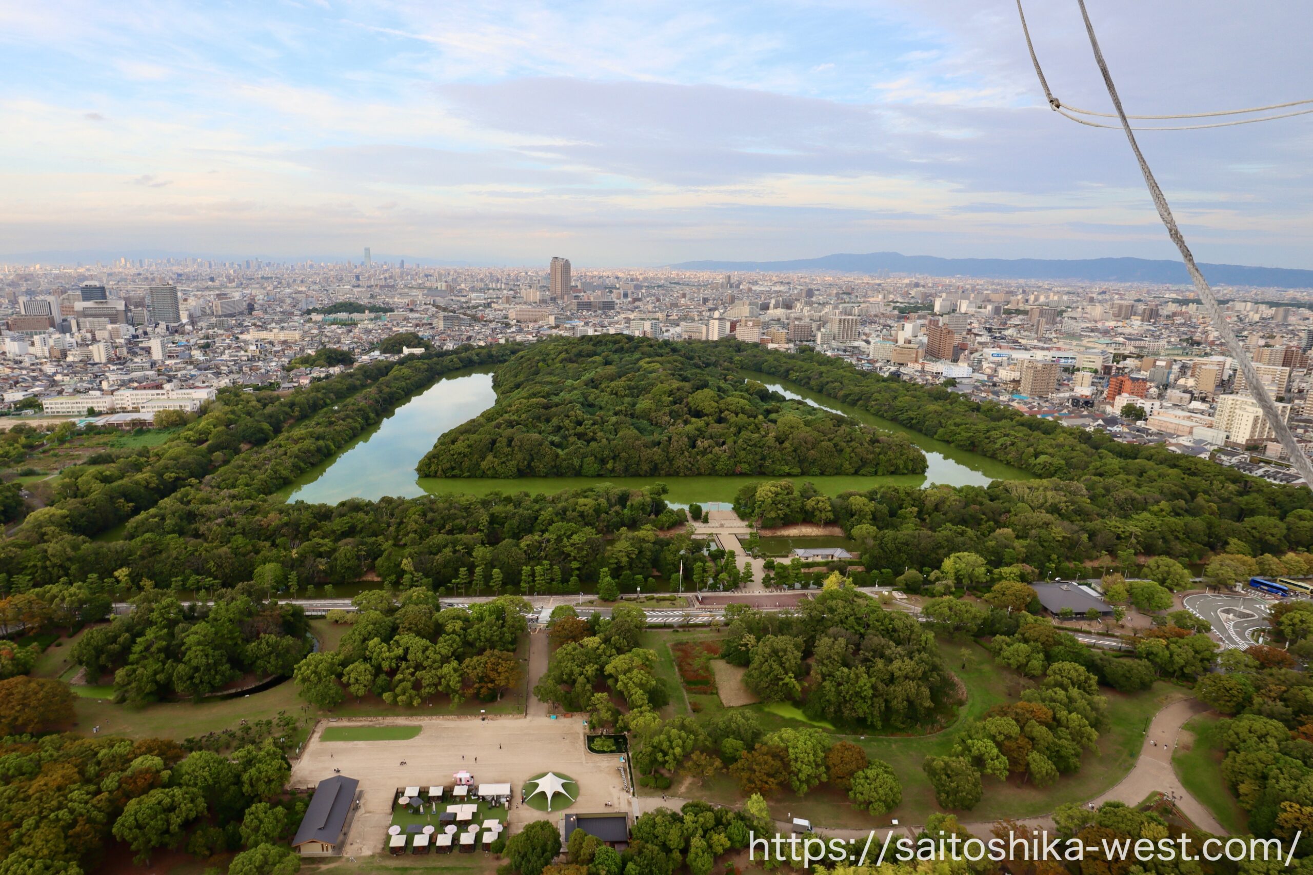 おおおおお!仁徳天皇陵が一望できます!斜め上から見る角度なので、鍵穴の形が完全に見えるわけではありませんが、それでも十分に楽しめます。ビルオタとしては、奥に見えるあべのハルカスや大阪都心の超高層ビル群に目が行ってしまいます。