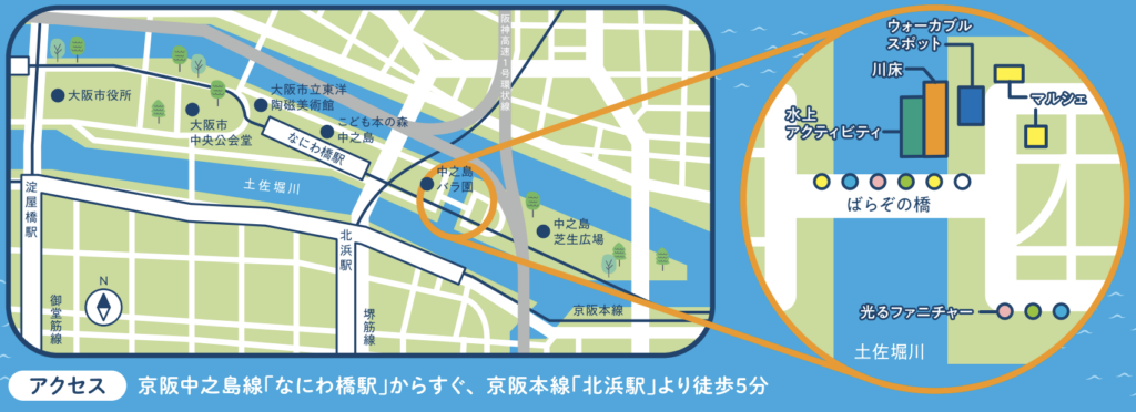 すべて中之島公園のばらぞの橋北東部にて実施され、滞在・移動・消費が結びつく空間構成が試みられます。