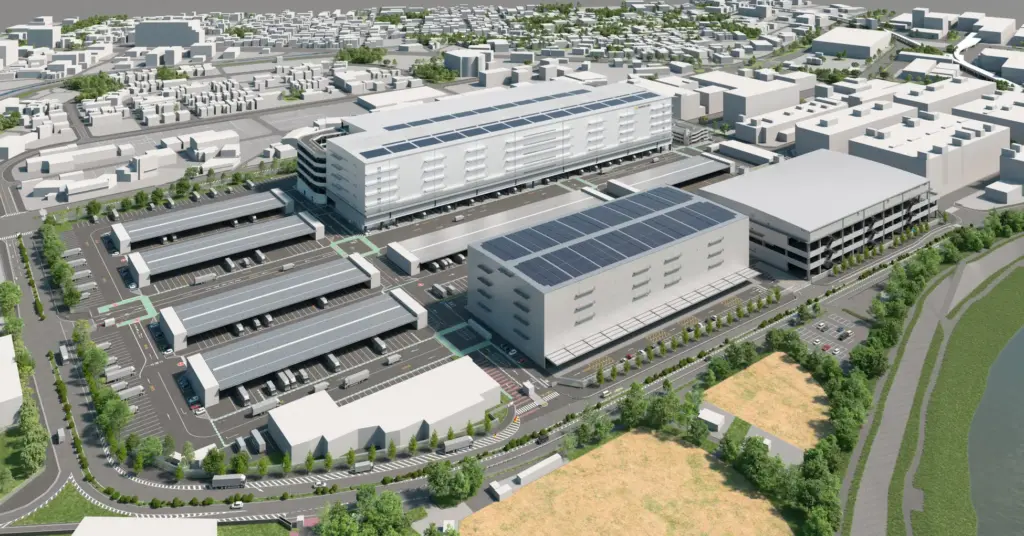 免震構造、EVトラック充電設備、自然採光システムなどを備え、環境対応と効率性を両立した次世代型物流拠点として開発が進められています。