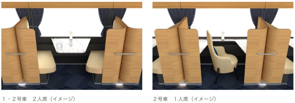 外観は志摩の「海・白砂・太陽」をモチーフに、青と白、そして金のラインで上質さを表現。4号車は革張り家具と間接照明を備えた特別室仕様、1・2号車は斜め配置のペアシートで車窓を最大限に楽しめる設計です。全車にパウダールームと大型荷物置場を設け、1号車には車いす対応スペースも備えます。