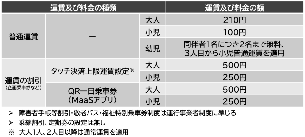 乗降は3扉の全扉乗降方式で、乗車時に1タップで決済します。運賃は大人210円、小児100円。現金、ICカード(マナカカードシステム)、クレジットカードのタッチ決済に対応し、1日上限500円の割引制度を導入します。QR一日乗車券(MaaSアプリ)は事前決済で、クレジットカード ・PayPayに対応。