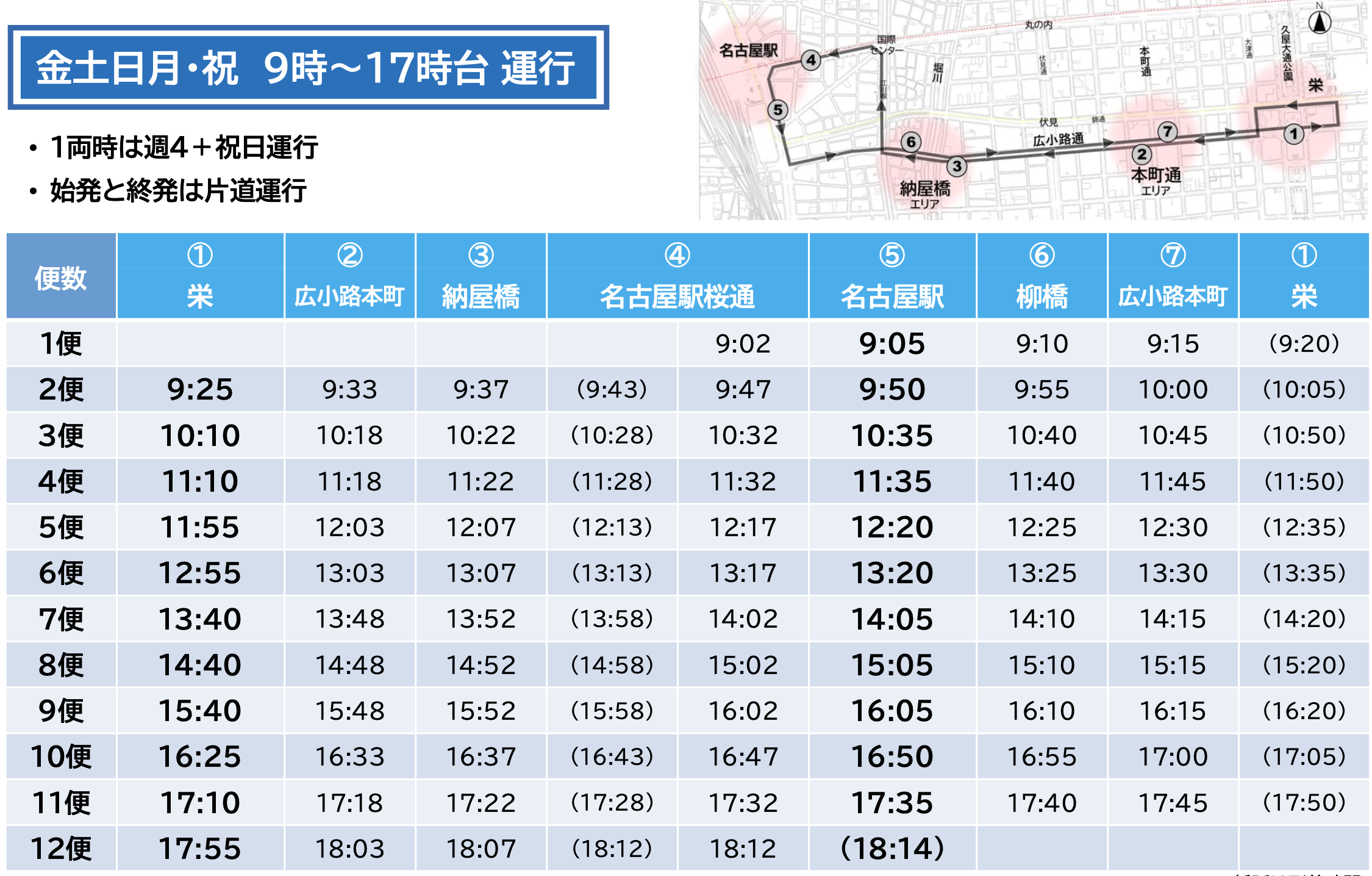 名古屋駅~栄間の総延長約5.6kmのルートを、全長18.125mの連節バス1両が走行。運行日は金曜から月曜および祝日で、9時から17時台に1日12本運行します。事業主体は名古屋市、運行事業者は名鉄バス株式会社です。名古屋都心の回遊性を高める新たな地上交通