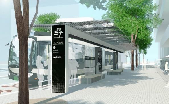 停留所はテラス型の「なごまちテラス」として整備され、ベンチやデジタルサイネージが設置されます。乗降空間としてだけでなく、まちの情報発信拠点として機能することを目指します。