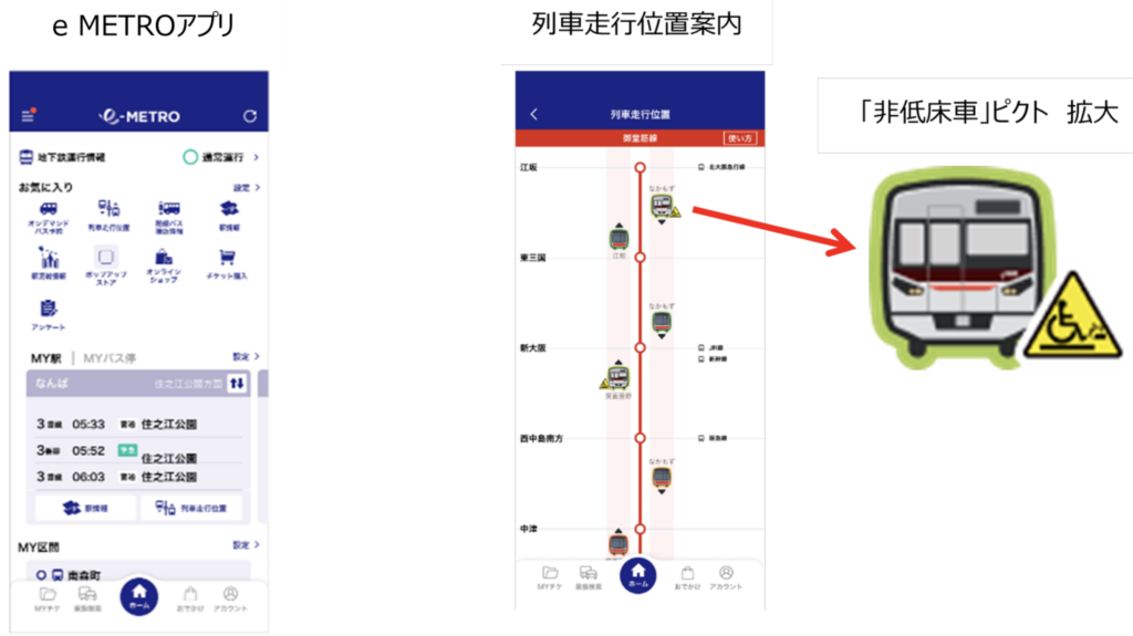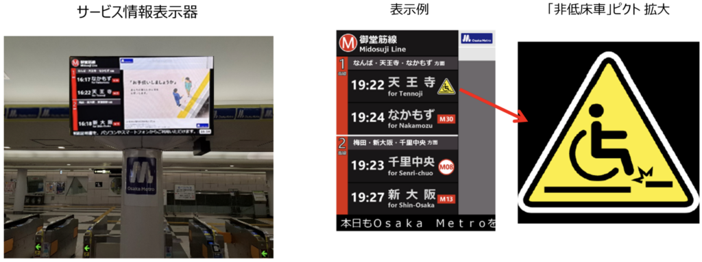 御堂筋線では北大阪急行電鉄の車両も乗り入れており、一部は低床化されていません。このため、Osaka Metroでは、非低床車の運行を事前に確認できる情報表示を導入しました。