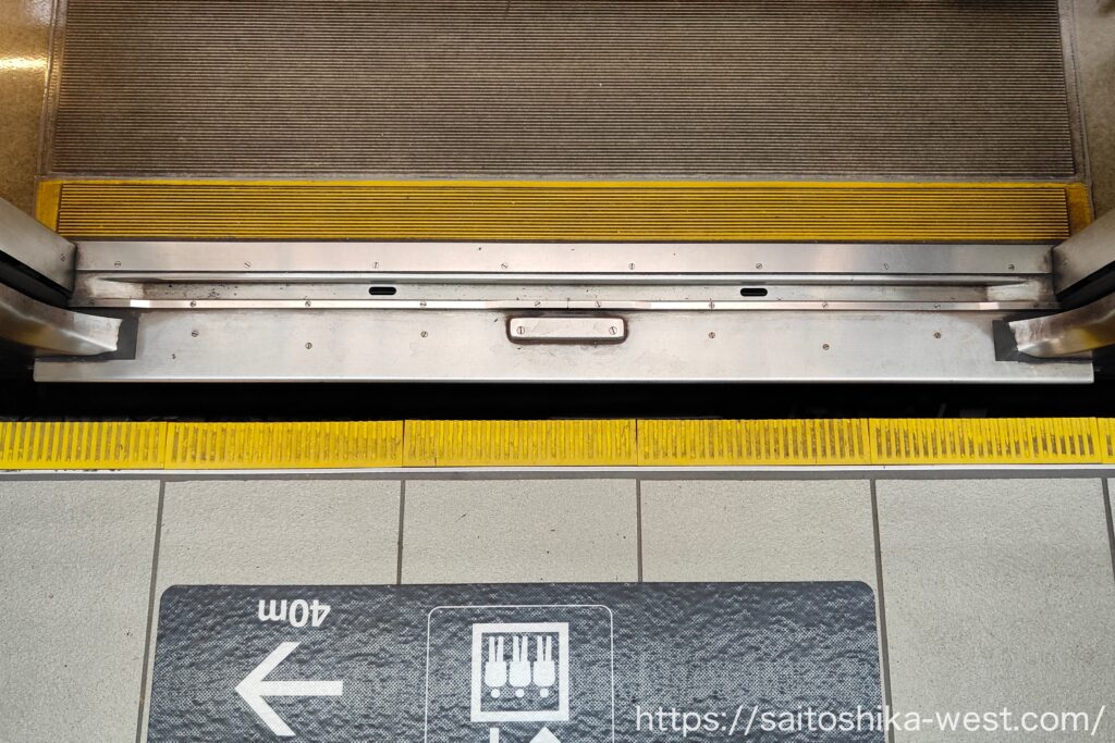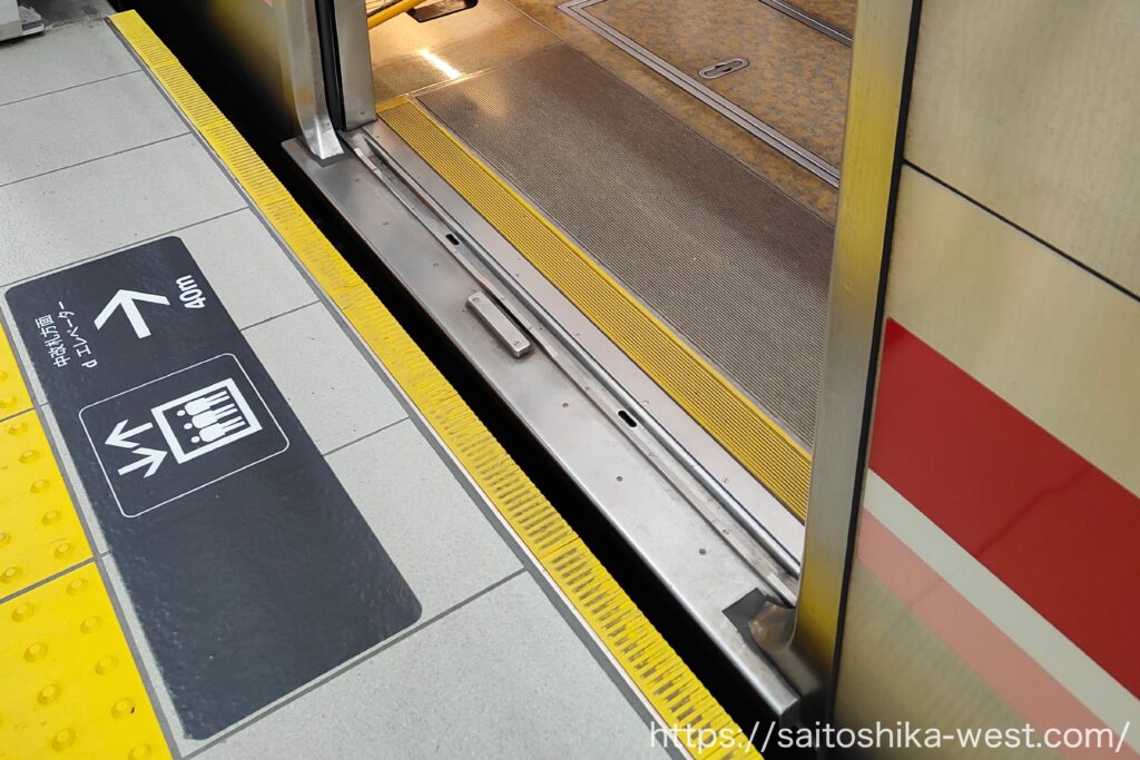 可動式ホーム柵には、低床車両が停車する3号車・5号車・8号車の車いす対応スペース位置に、段差が小さい(単独乗降が可能)ことを示す大型の案内シートを掲示。利用者が一目で該当位置を認識できるようにすることで、案内のわかりやすさを高めています。