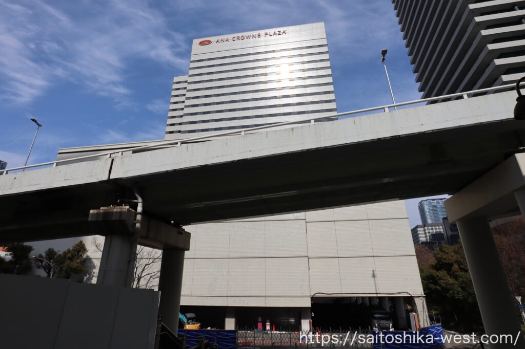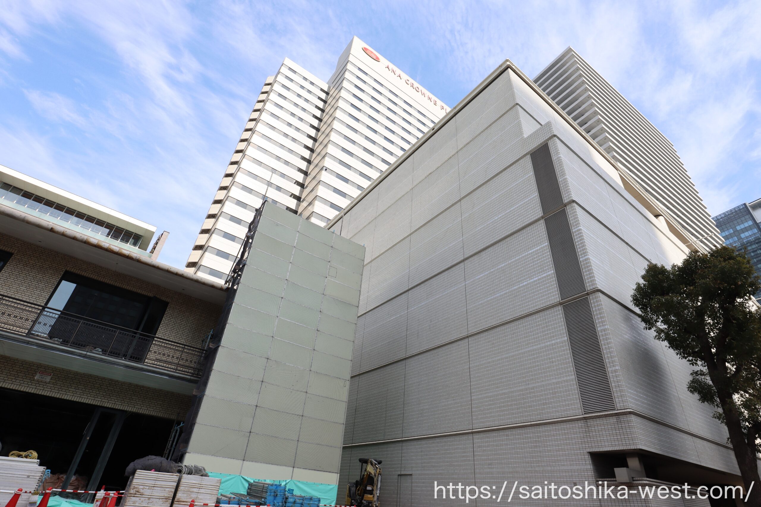 ANAクラウンプラザホテル大阪側の様子です。外観はロゴマークが取り外された程度で、大きな変化はありませんでした。