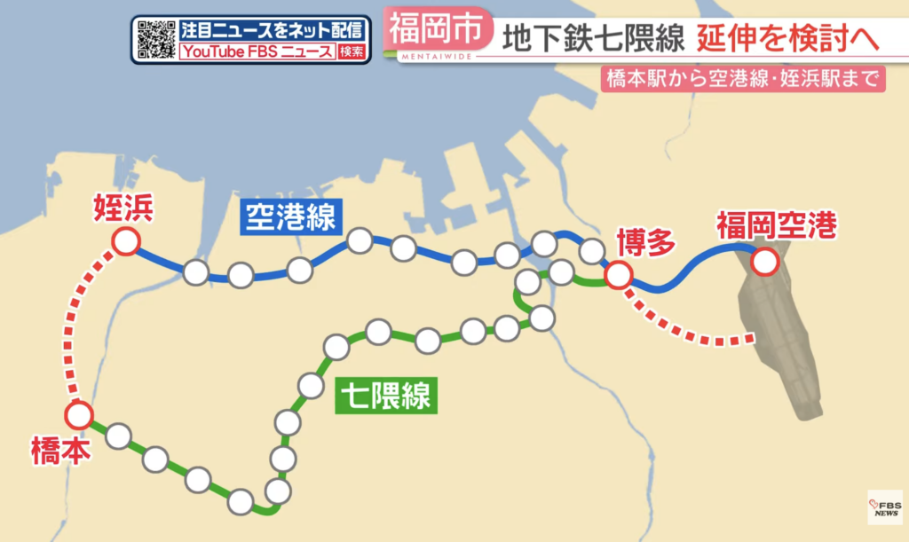 橋本〜姪浜延伸が実現すると、七隈線と空港線が環状に接続し、都市構造の偏りを改善できます。