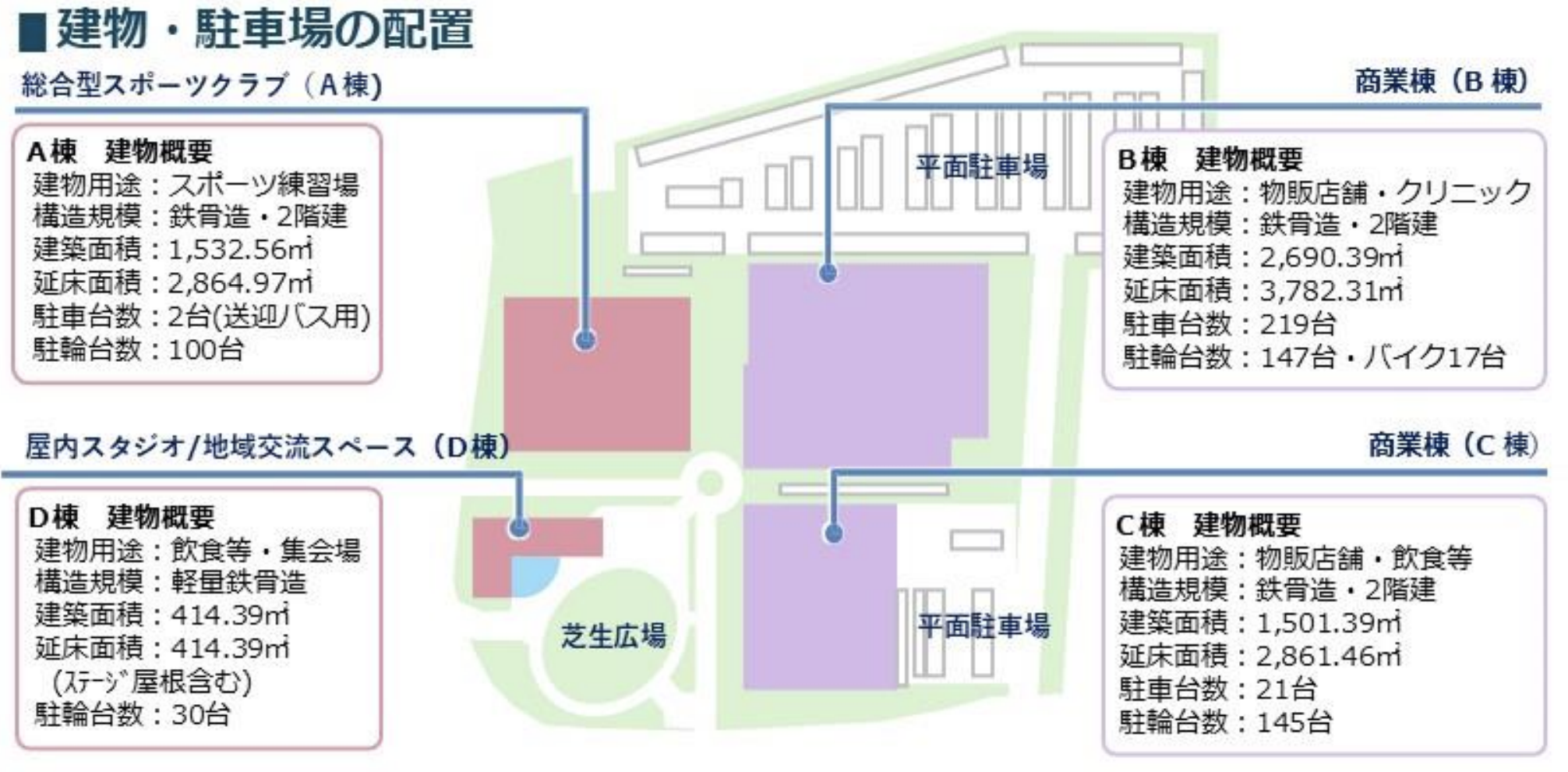 | A棟 | 総合型スポーツクラブ | 約15,325㎡ | プール、アリーナ、ジム、スタジオ 等 | 約100台 |